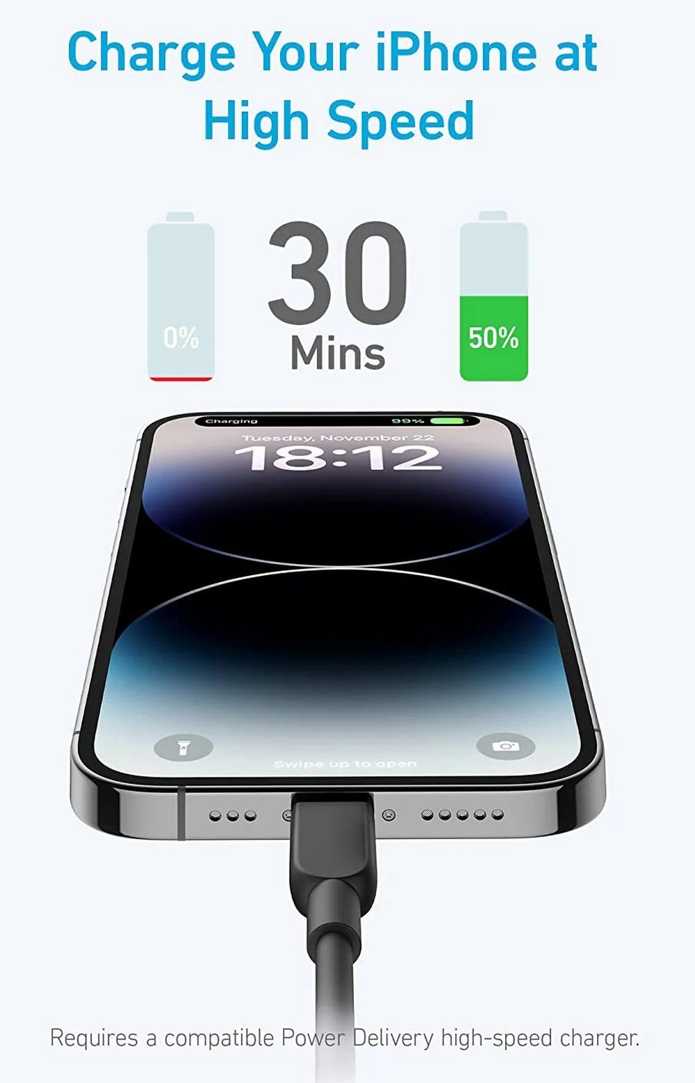 Power up your iPhone to 50% in just 30 minutes when you use a compatible Power Delivery USB-C charger (not included).