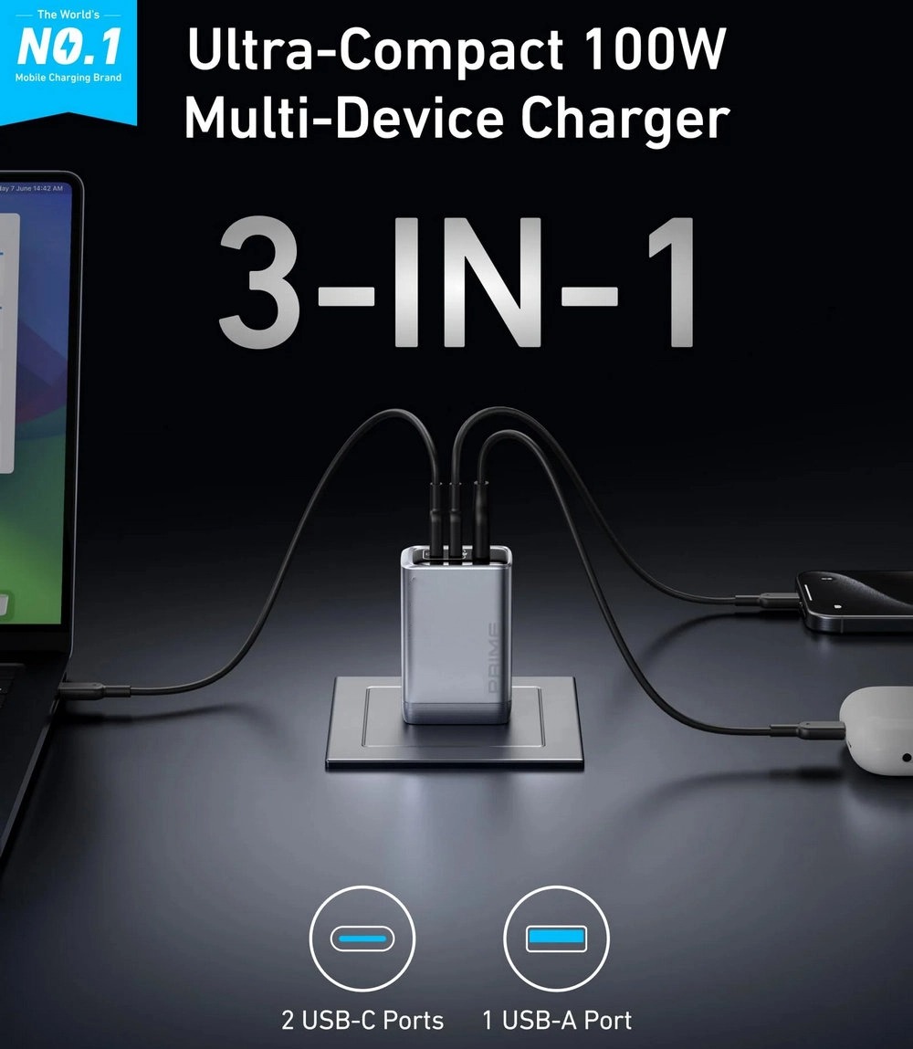 100W Multi-Device Fast Charger: Power up three devices simultaneously with a total of 100W output through two USB-C and one USB-A port for efficient power distribution.