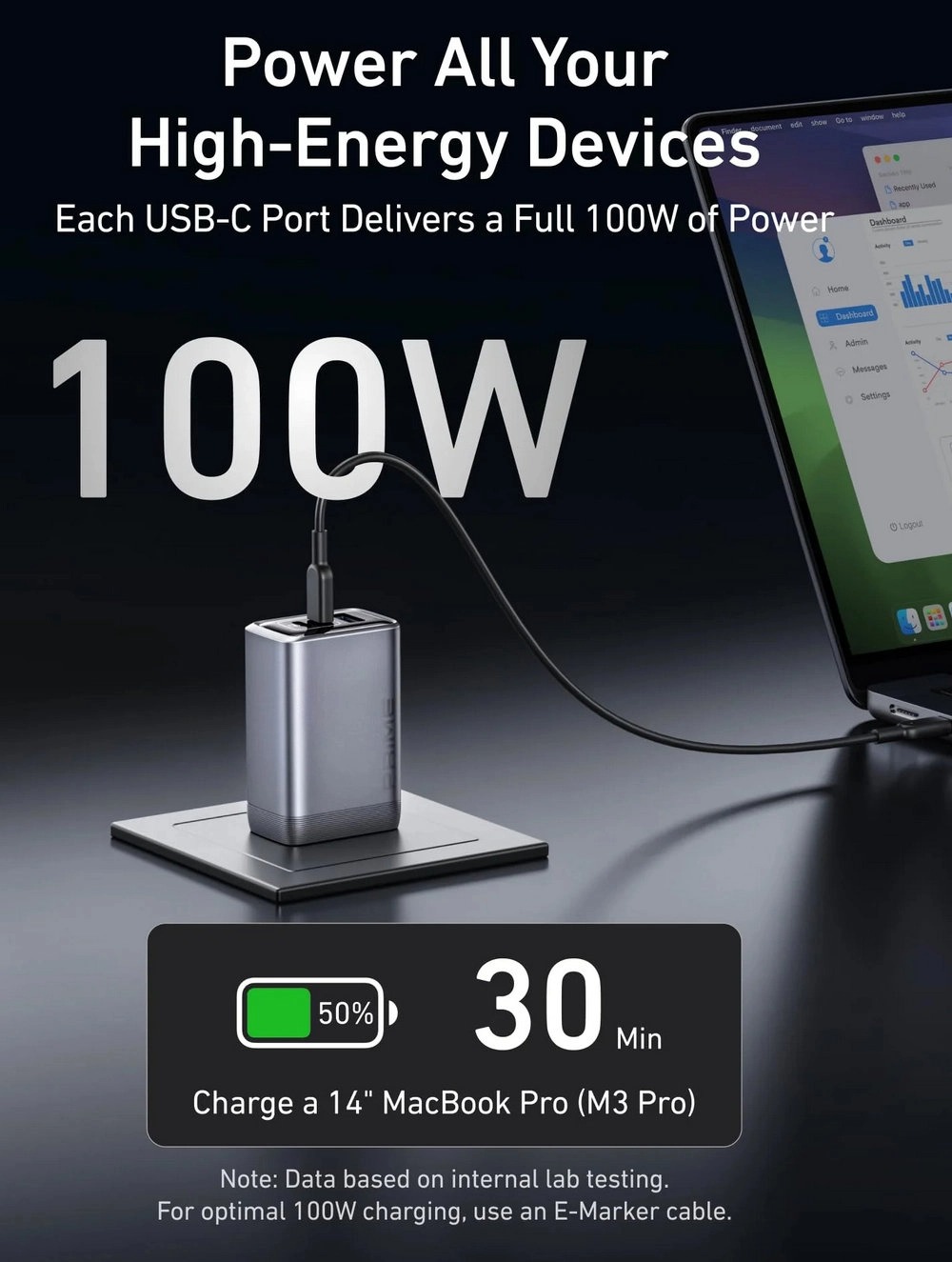 Maximum Power with USB-C: Each USB-C port delivers a full 100W, efficiently charging your 14-inch MacBook Pro (M3 Pro) from 0 to 50% in just 30 minutes.