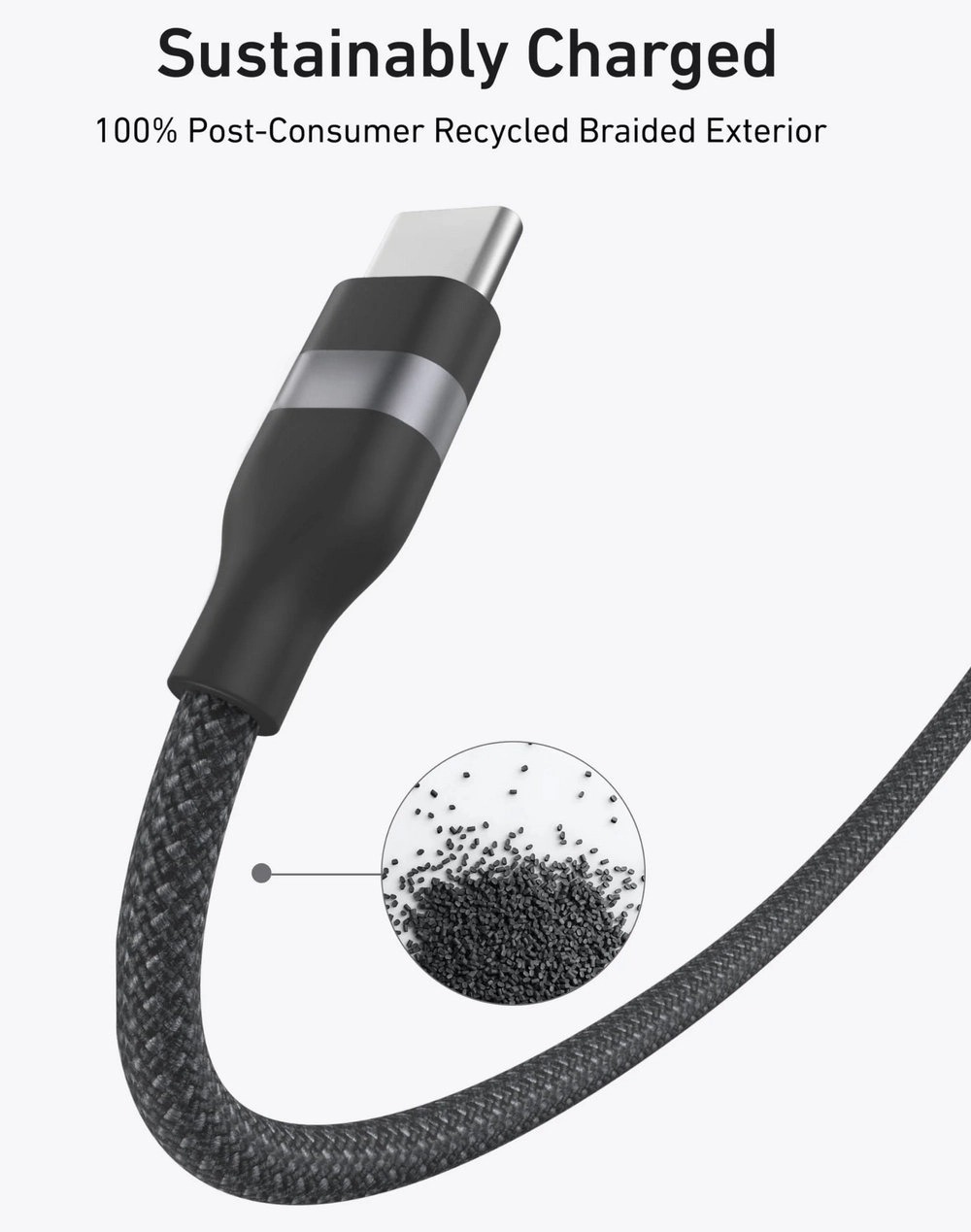 Sustainably Made Cable: Support a greener future with each use, featuring an outer layer crafted from 100% post-consumer recycled materials.