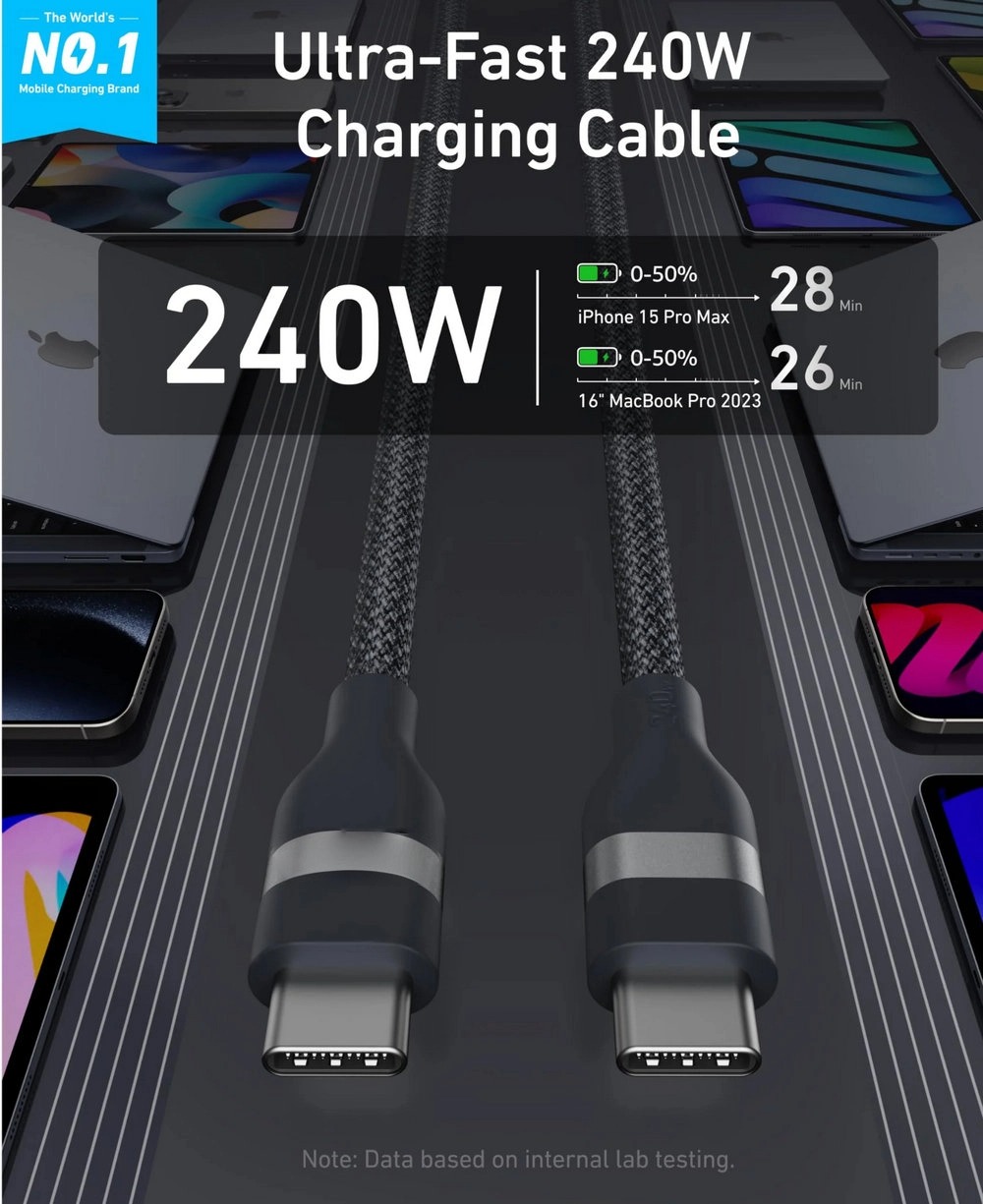 Ultra-Powerful 240W Charging: Lead a more efficient life with the capability to boost a 16-inch MacBook Pro (M3 Pro) to 50% in just 26 minutes, thanks to the 240W power. (Note: This cable does not support screen mirroring.)