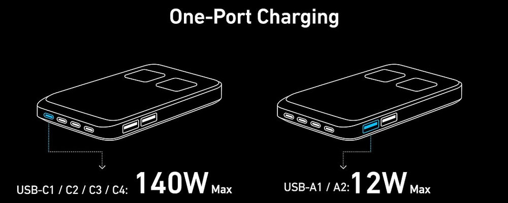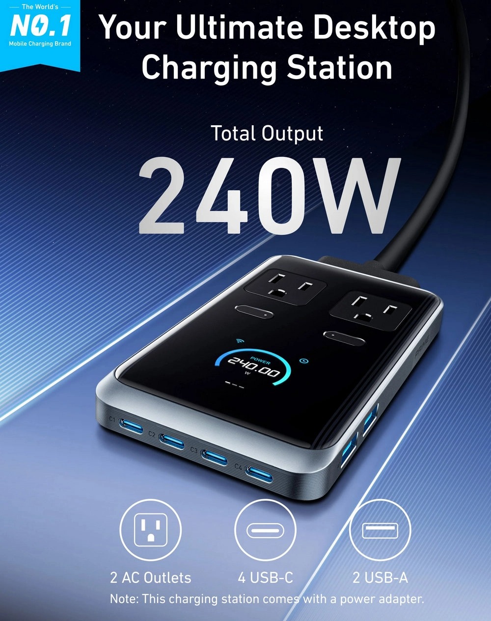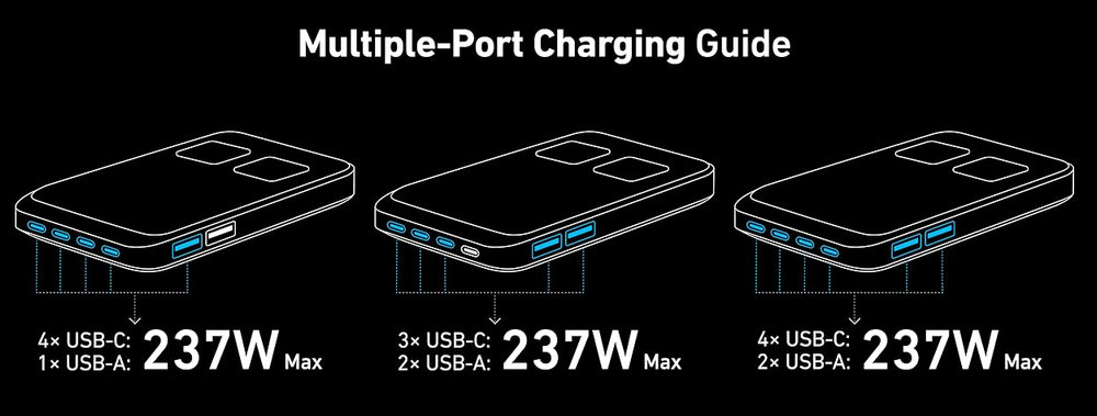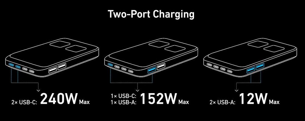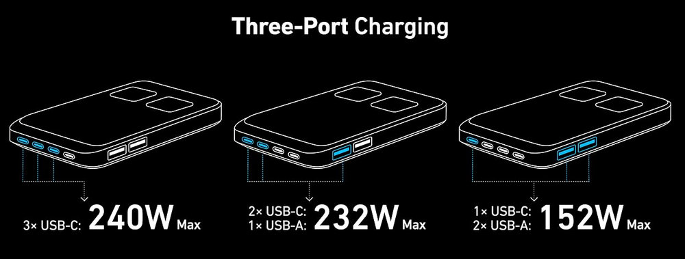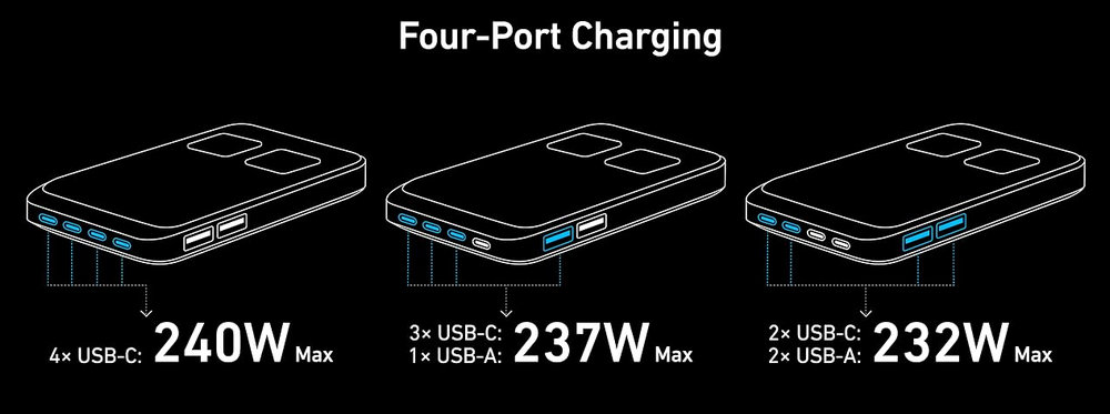 Featuring 240W of total power output across 2 AC outlets, 4 USB-C, and 2 USB-A ports, this charging station can handle all your devices simultaneously, with up to 140W from any single USB-C port.