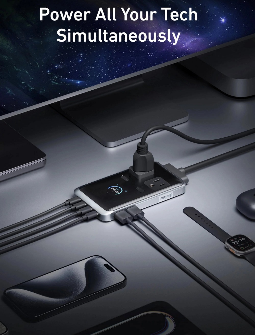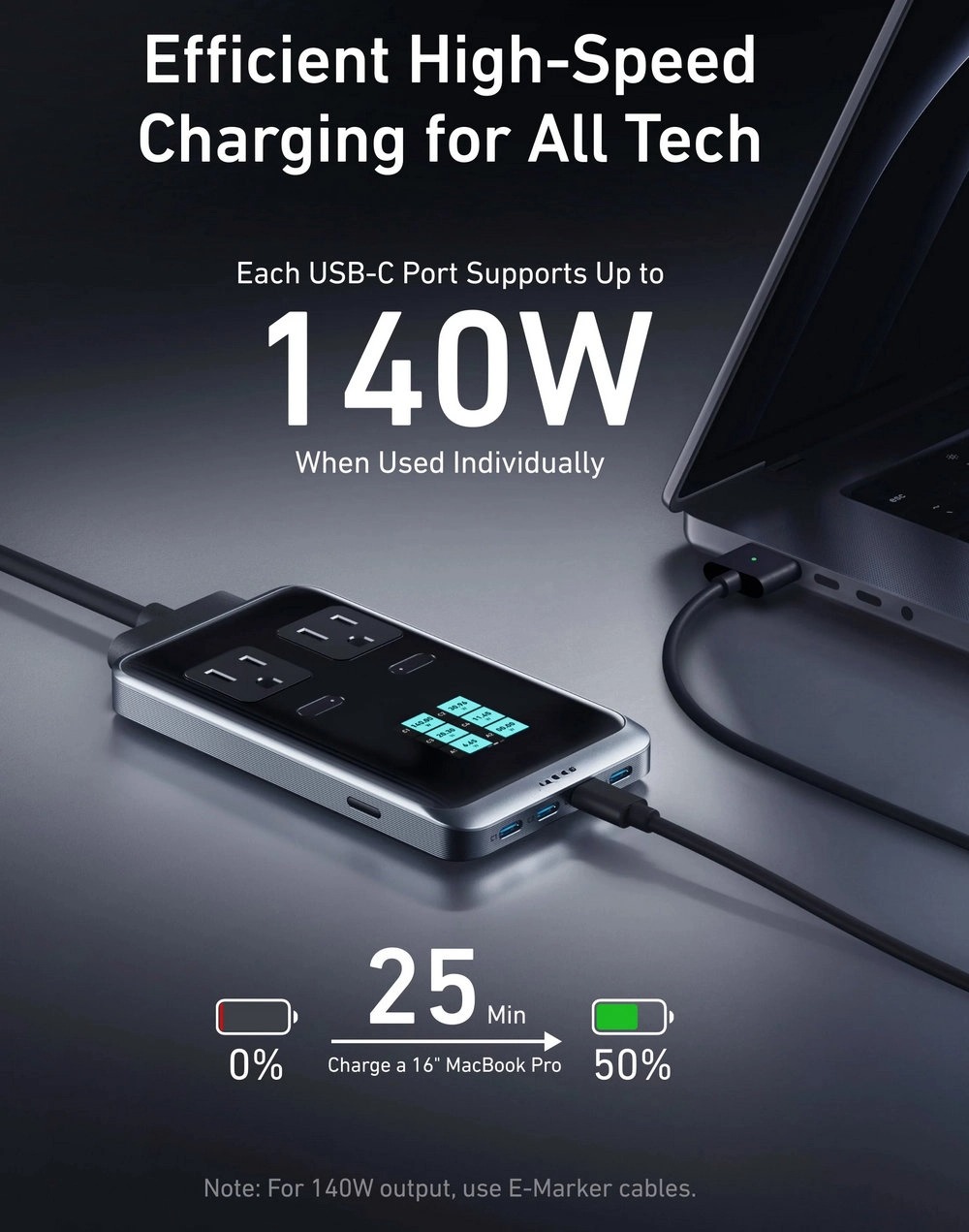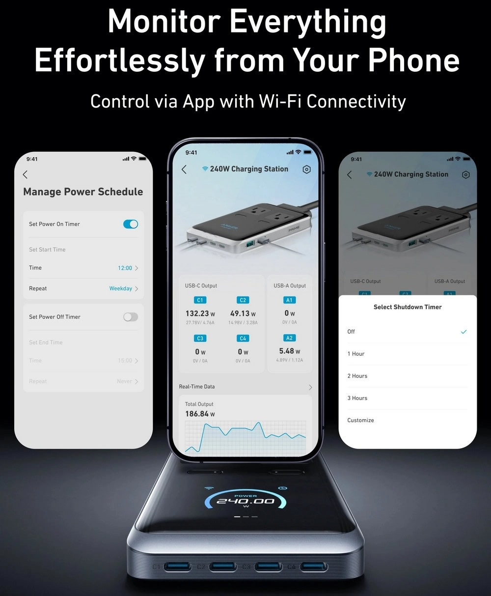 Featuring 240W of total power output across 2 AC outlets, 4 USB-C, and 2 USB-A ports, this charging station can handle all your devices simultaneously, with up to 140W from any single USB-C port.