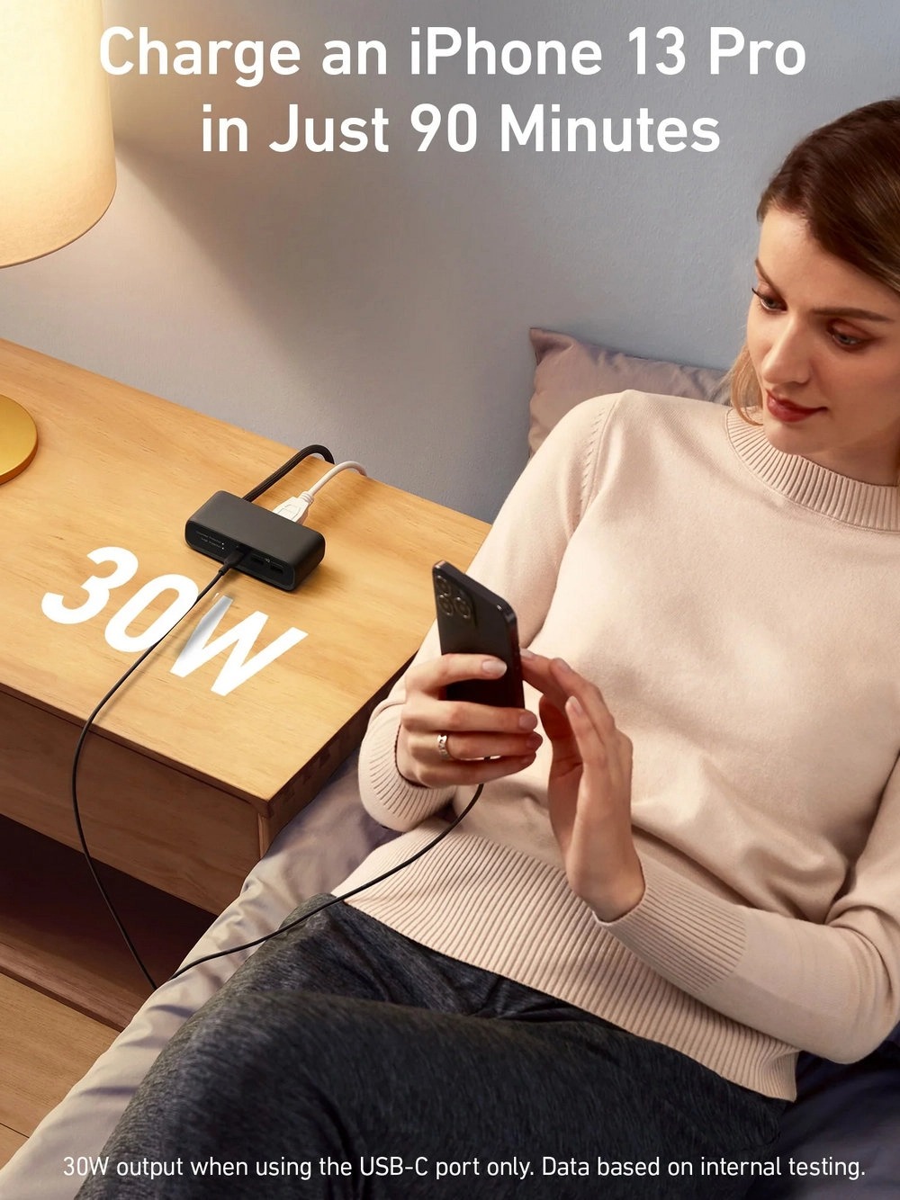 The 30W USB-C port delivers enough power to fully charge an iPhone 13 Pro in just 90 minutes. Note: 30W charging is only achievable when the other USB ports are not in use.