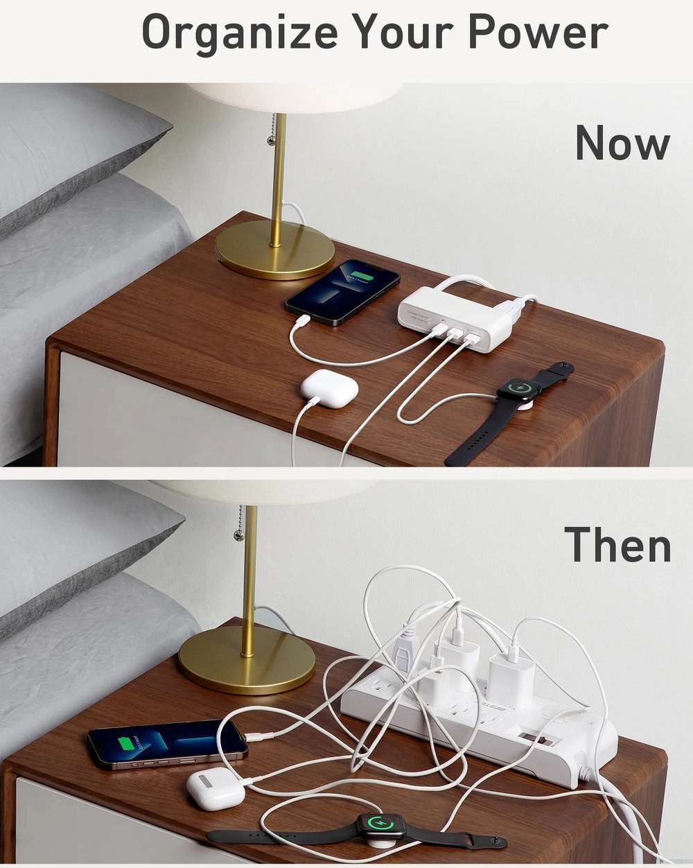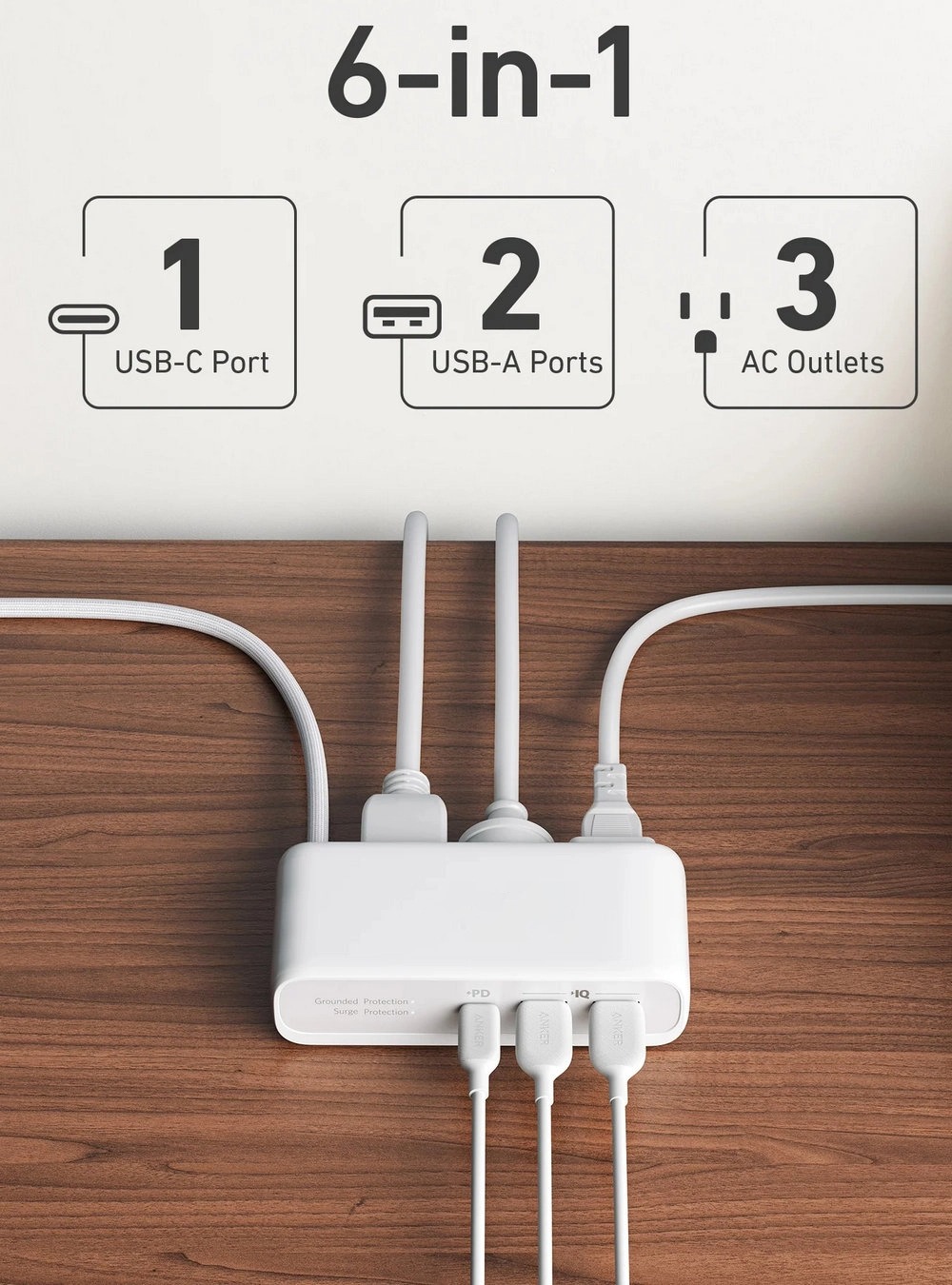 The 3 AC outlets are on the rear so you can easily direct power cords toward the back of your desk while having simple, clutter-free access to the front-facing USB and USB-C ports.