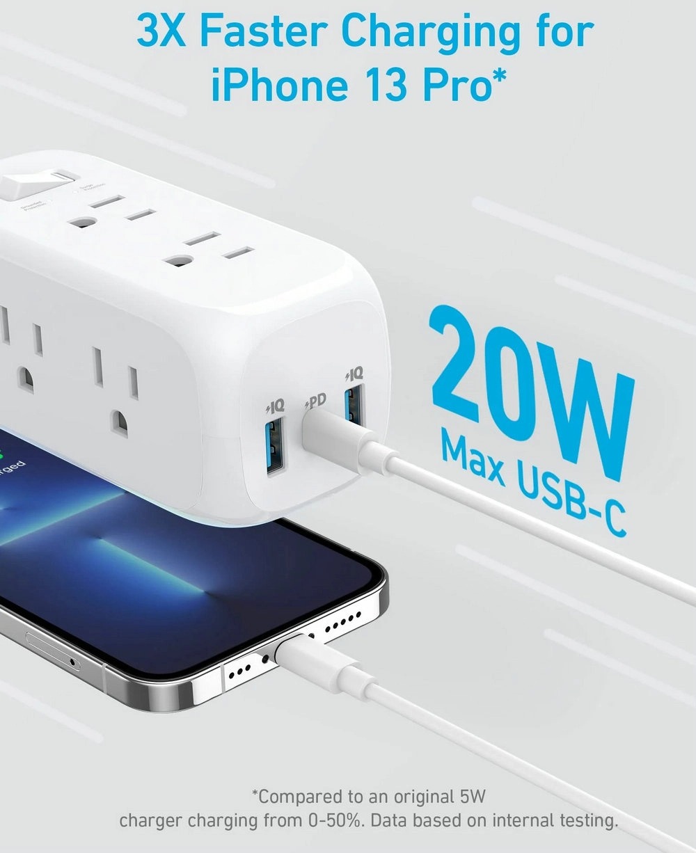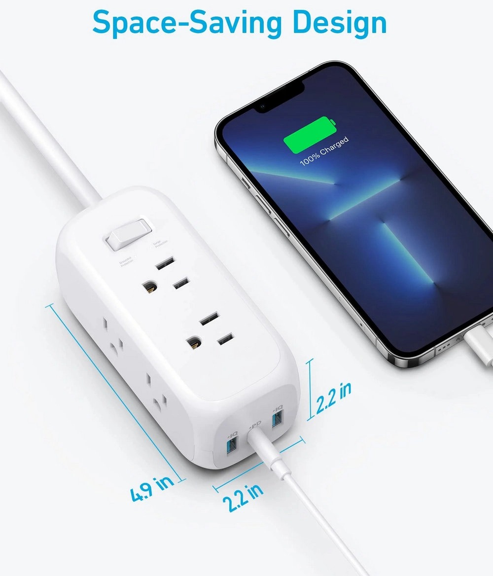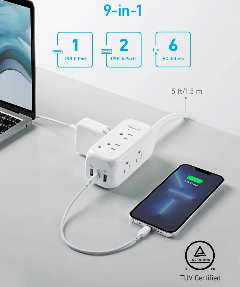 With 6 AC outlets, 1 USB-C port, and 2 USB charging ports, you can power and charge up to 9 devices from a single wall outlet.