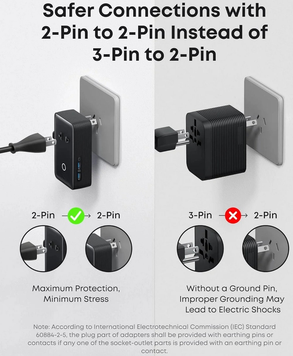 Experience peace of mind with a safe 2-pin to 2-pin setup designed to prevent electric shocks and ensure your travels are worry-free.
