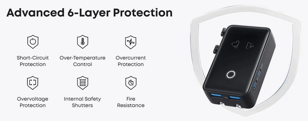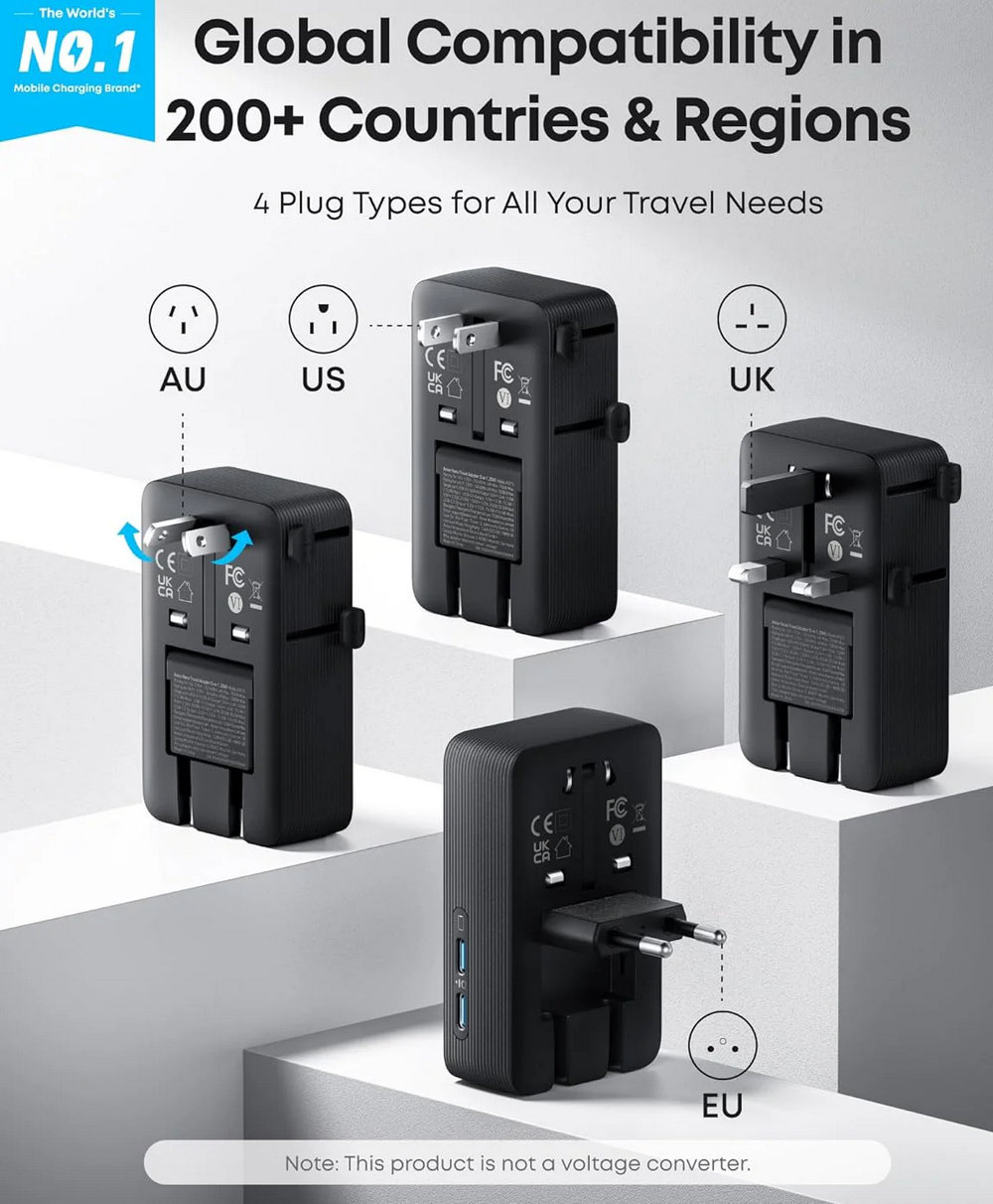 Equipped with four essential plug types—Type A, Type I, Type G, and Type C—to meet all your travel needs worldwide.