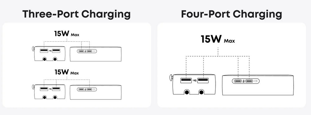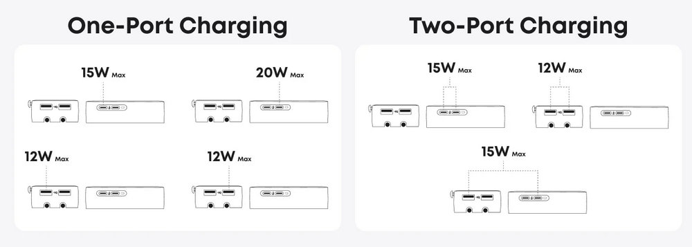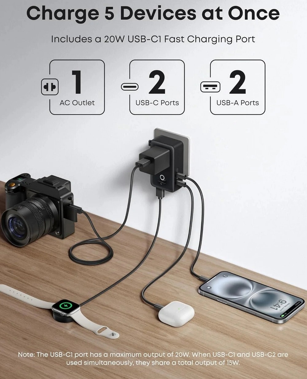 Charge five devices at the same time with an AC outlet, two USB-A ports, and two USB-C ports, one of which delivers 20W fast charging to keep everything powered up efficiently. Recharge an iPhone 16 to 50% in just 28 minutes.