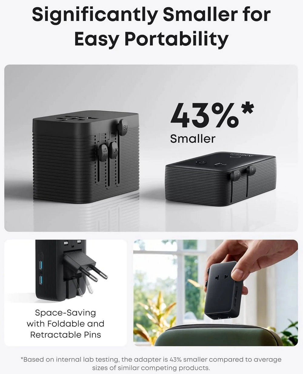 Enjoy more packing space with a design that is 43% smaller than similar models. Includes foldable and retractable pins for enhanced portability.