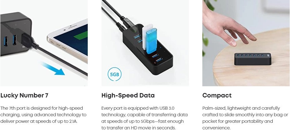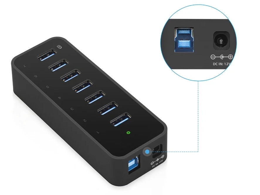 7 High-Speed Data Ports Instantly add 7 USB 3. 0 SuperSpeed ports to your PC and enjoy data transfer rates of up to 5Gbps. Fast Charging The dual functionality of the 7th port enables data transfer while still providing a full 1. 5A charging speed. (Ensure that the power adapter is connected and plugged in. )
