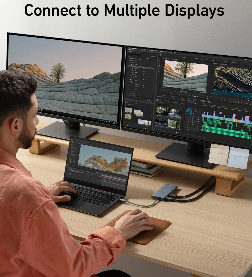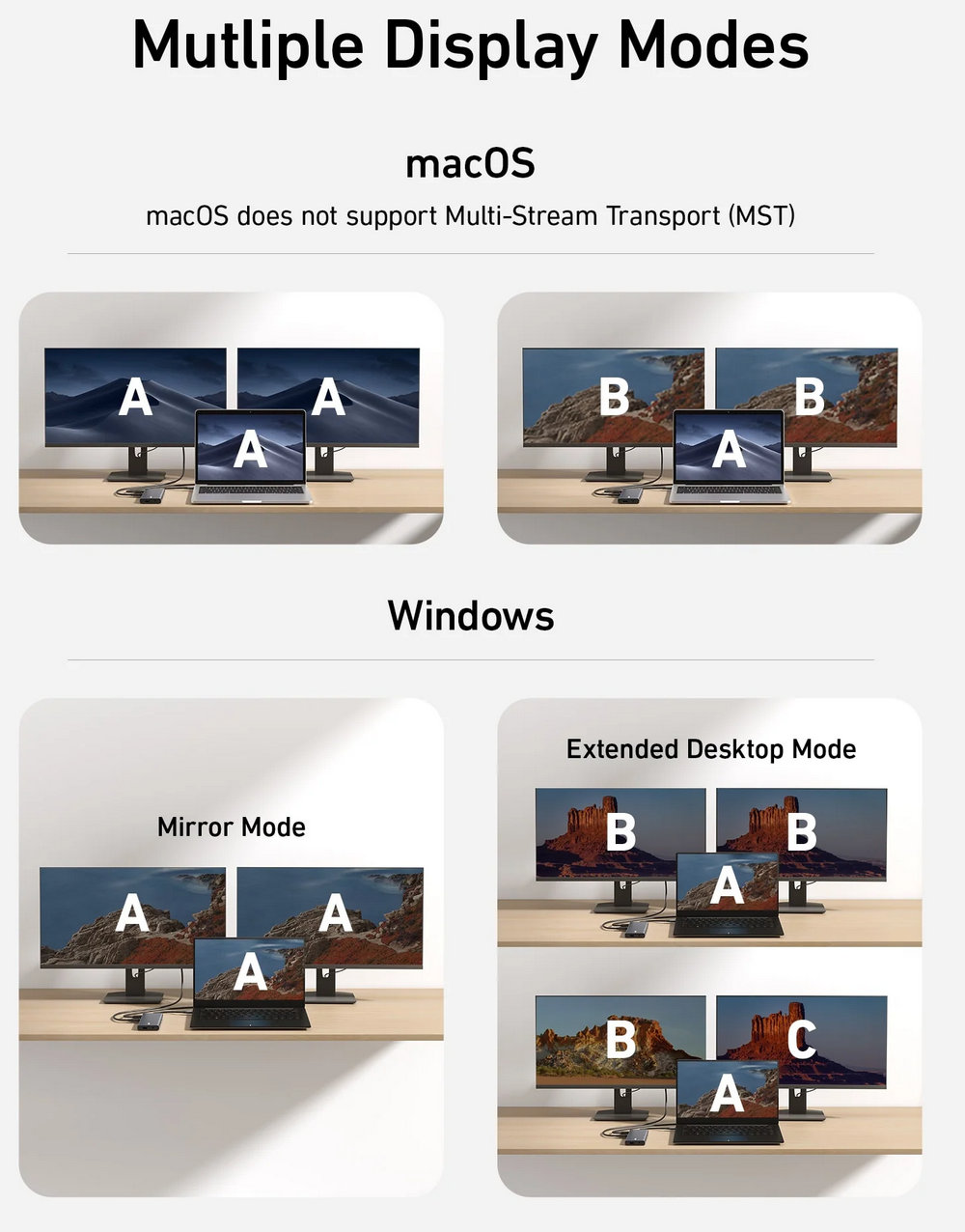 The two connected monitors show the same content, while your laptop's screen shows something else.