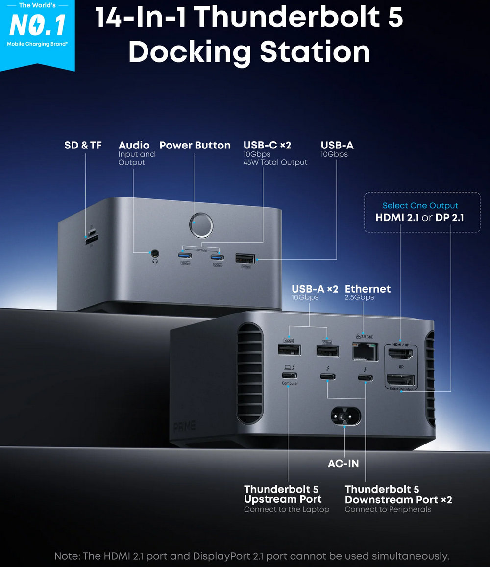 14-in-1 Thunderbolt 5 Dock: Equipped with a Thunderbolt 5 upstream port, two Thunderbolt 5 downstream ports, two USB-C ports, three USB-A ports, SD and TF card readers, an AC input, a 2.5Gbps Ethernet port, an audio jack, and an HDMI 2.1 or DisplayPort 2.1 port. It also includes an advanced active cooling system for optimal performance even under full load, preventing overheating.