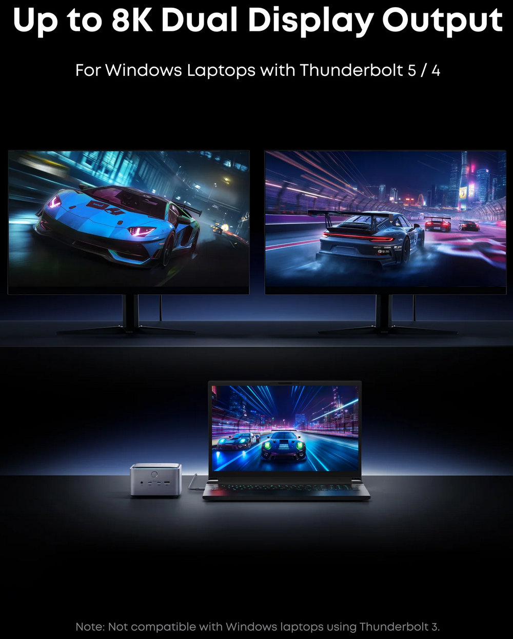 Dual Display Docking Station: Supports one HDMI or DisplayPort and two Thunderbolt 5 downstream video outputs. Delivers up to 8K@60Hz for a single display, or dual 8K@60Hz for Thunderbolt 5 Windows laptops.