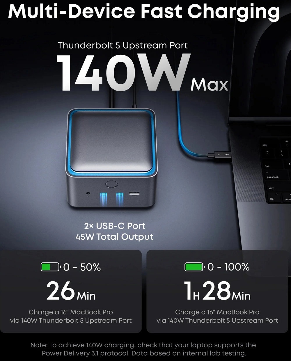 Fast Charge Multiple Devices: Power your devices efficiently with the powerful 140W max Thunderbolt 5 upstream port, supporting the PD 3.1 protocol for optimal charging. The front-facing dual USB-C ports share a total of 45W.