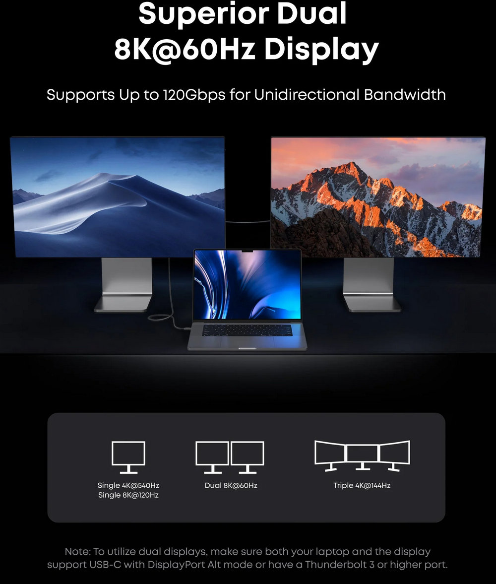 8K Display Capabilities: Support for dual 8K displays at 60Hz delivers stunning clarity and detail with up to 120Gbps bandwidth.