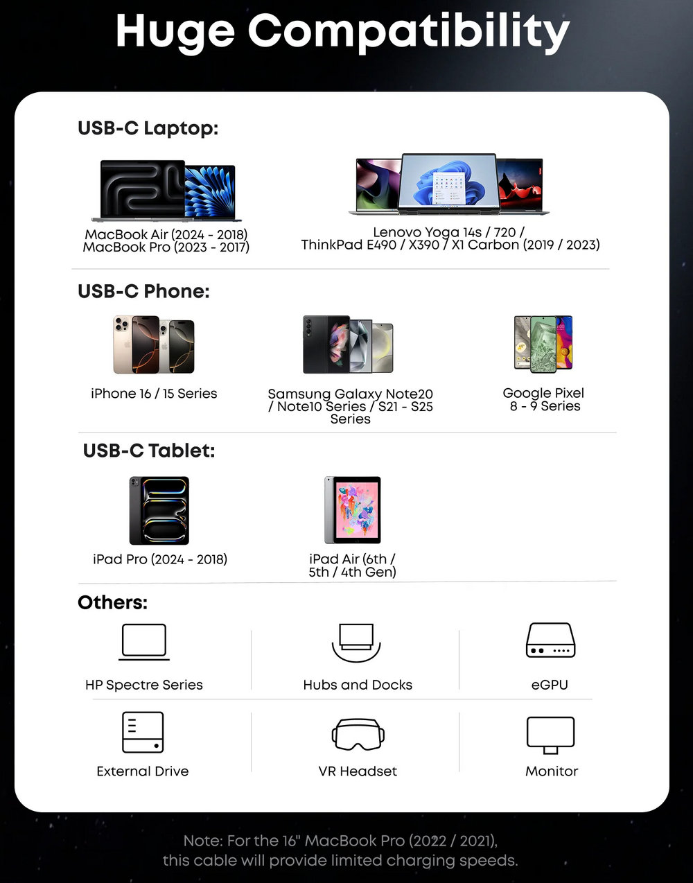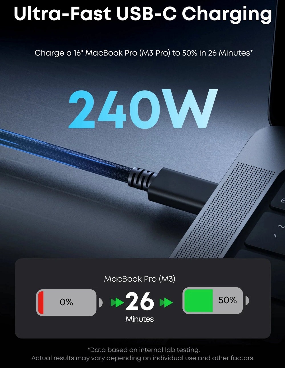 240W USB-C Charging: Charge a 16-inch MacBook Pro (M3 Pro) to 50% in just 26 minutes with ultra-fast 240W USB-C charging.