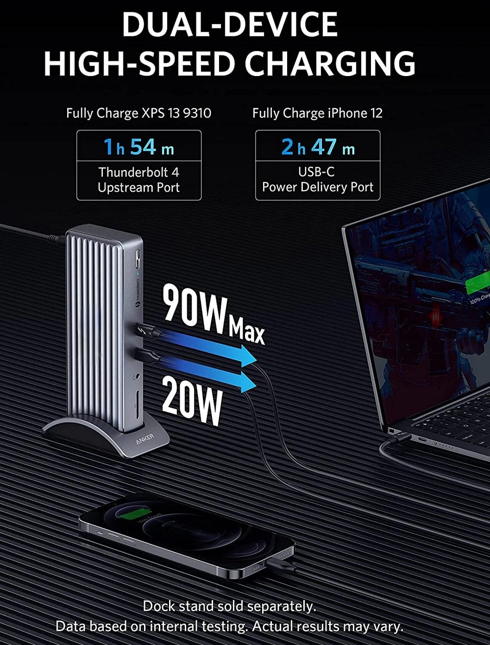 A1: This dock supports up to 90W of charging via the Thunderbolt 4 upstream port on the front of the dock (indicated with a computer icon). This means that if your laptop comes with a 100W or above power adapter, the charging speed will be slower than you’re used to. The USB-C Power Delivery port (indicated by “PD”) supports up to 20W fast charging for your phone. The Thunderbolt 4 downstream port supports 15W charging for smaller devices.