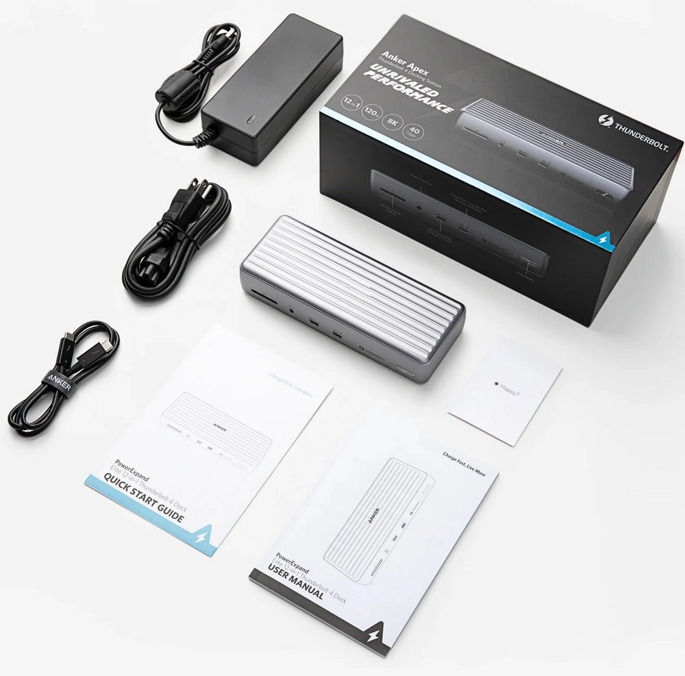s.handsome Apex 12-in-1 Thunderbolt 4 Docking Station (dock stand not included), 120W power adapter, 1.2m power cord, 0.7m Thunderbolt 4 cable, welcome guide