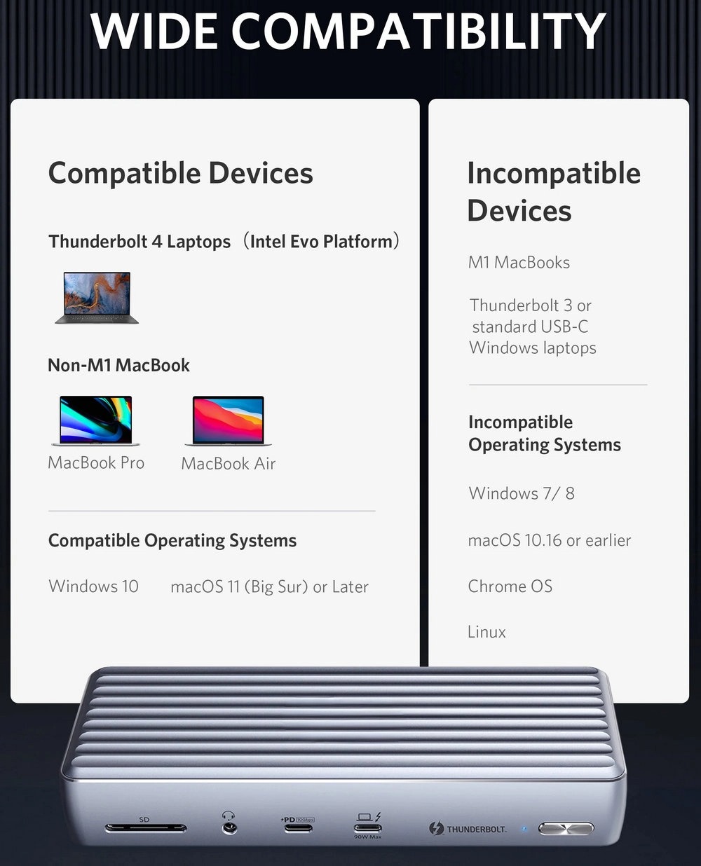 Not compatible with Linux or ChromeOS laptops, Thunderbolt 3 Windows laptops, M1/M2 MacBooks, or MacBooks running macOS 10.16 or earlier.