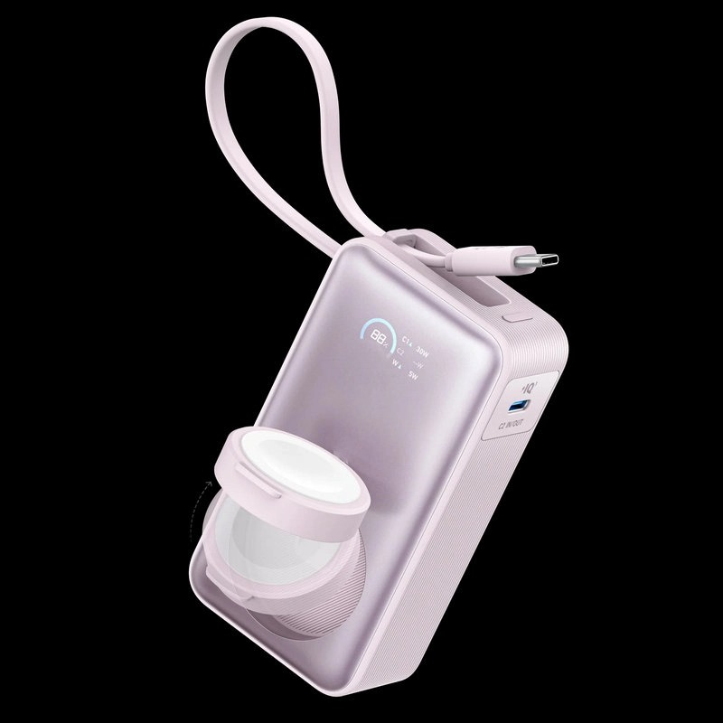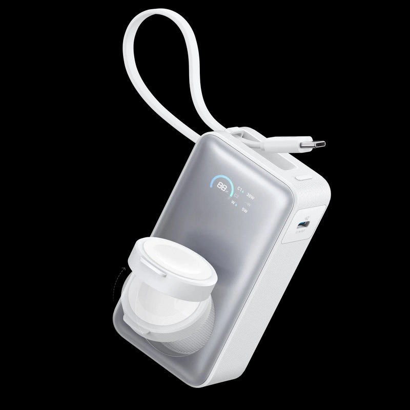 Supports simultaneous device charging with the built-in cable or port, offering up to 30W, alongside a wireless watch charger that provides up to 5W. The power bank fully recharges in 1.5 hours with a 30W maximum input.