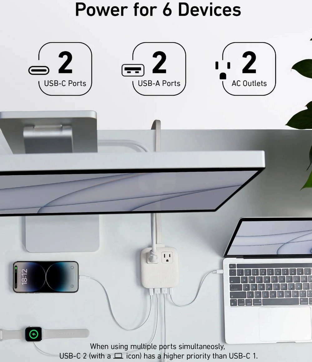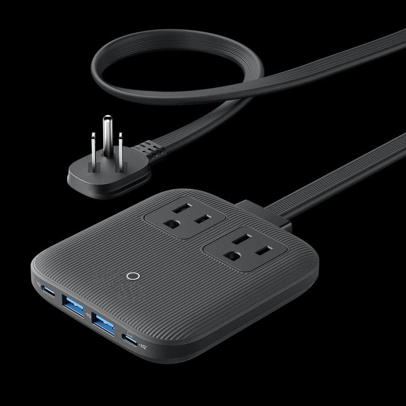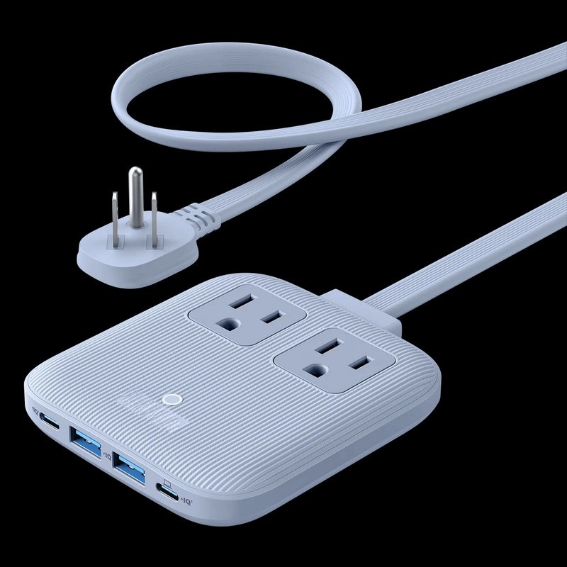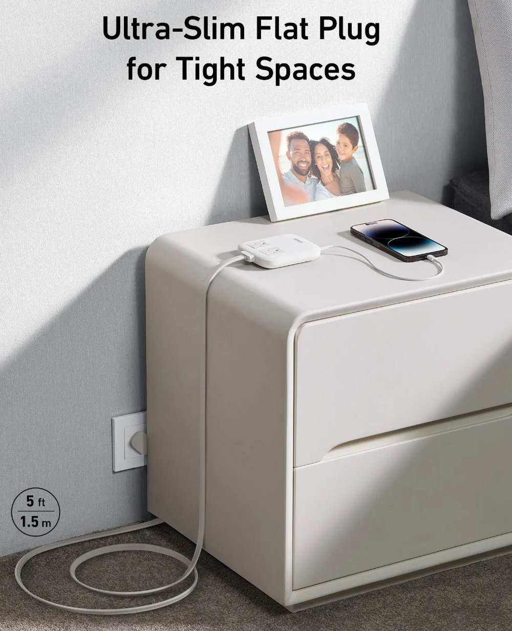 The ultra-slim power strip features a flat AC plug and a soft, flat extension cord, maximizing space efficiency in your home or workspace.