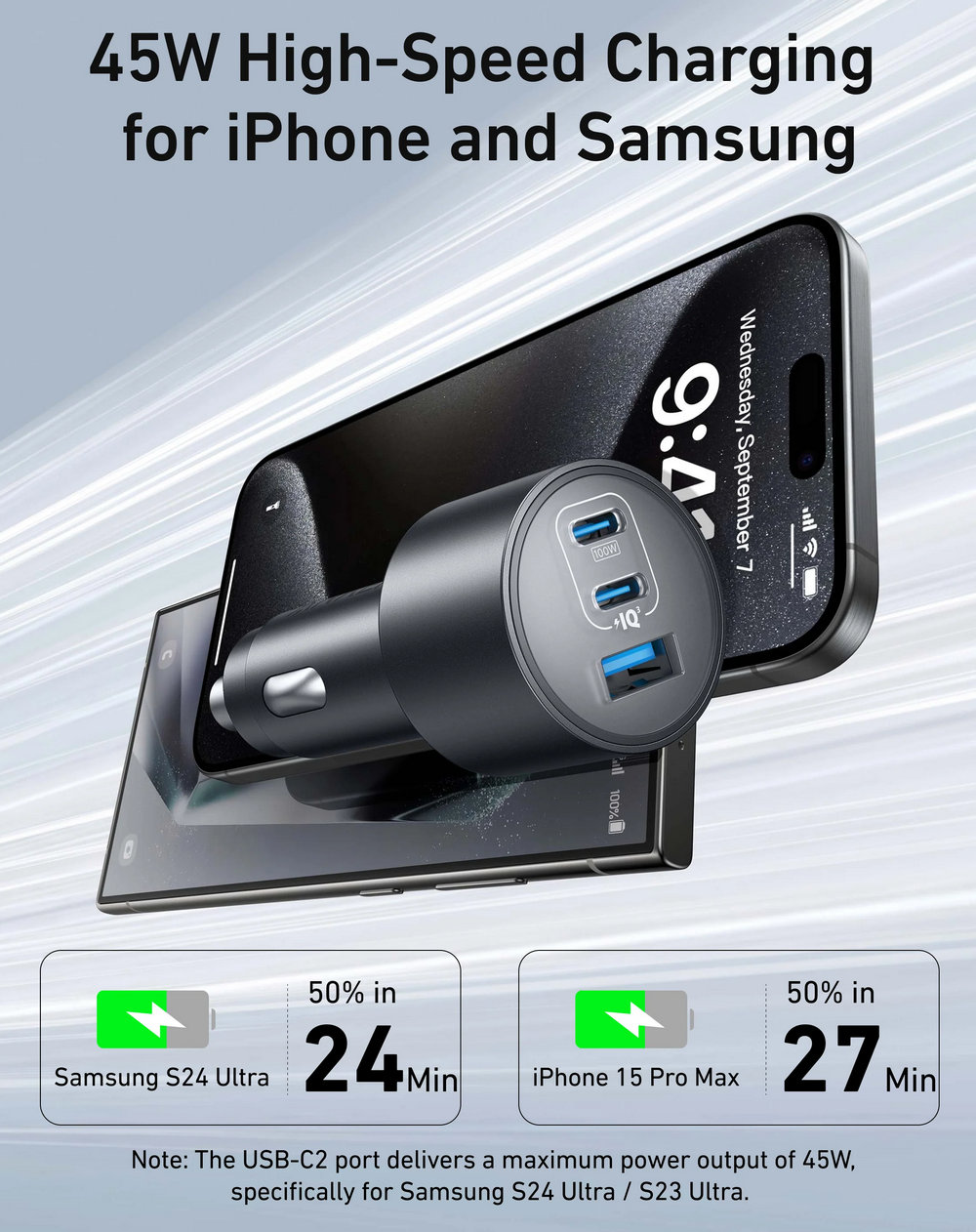 The second USB-C port offers 45W max of power, providing fast and reliable charging for iPhones and Samsung devices, keeping you connected without any delays.