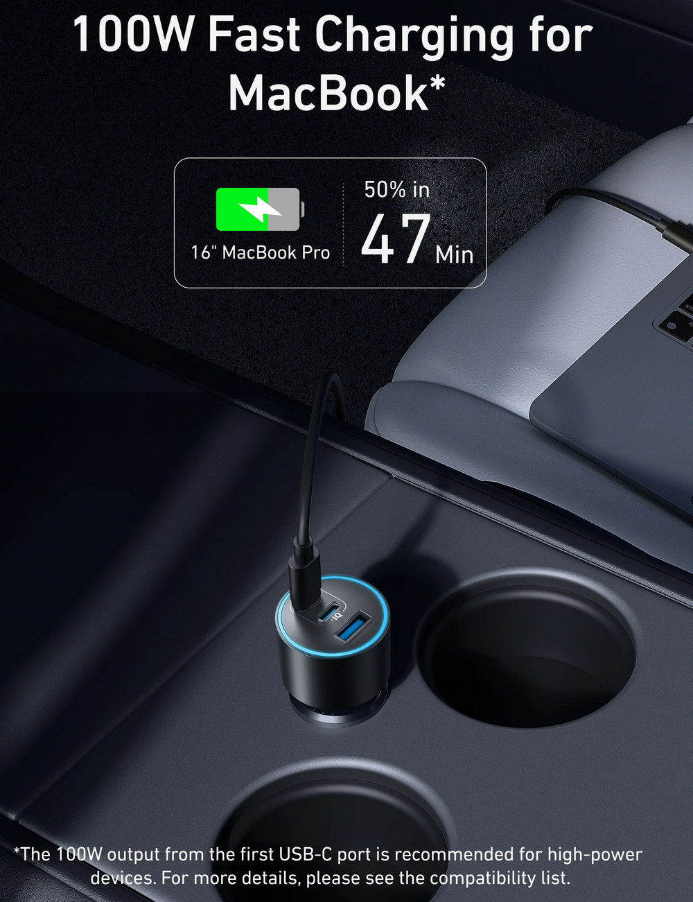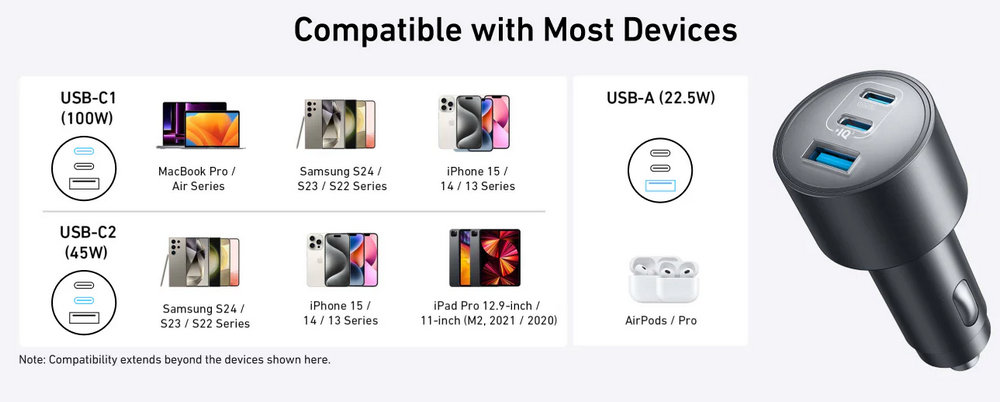 Seamlessly power up all your essential devices with the first USB-C port delivering a powerful 100W, the second USB-C port providing 45W, and the USB-A port adding an additional 22.5W.