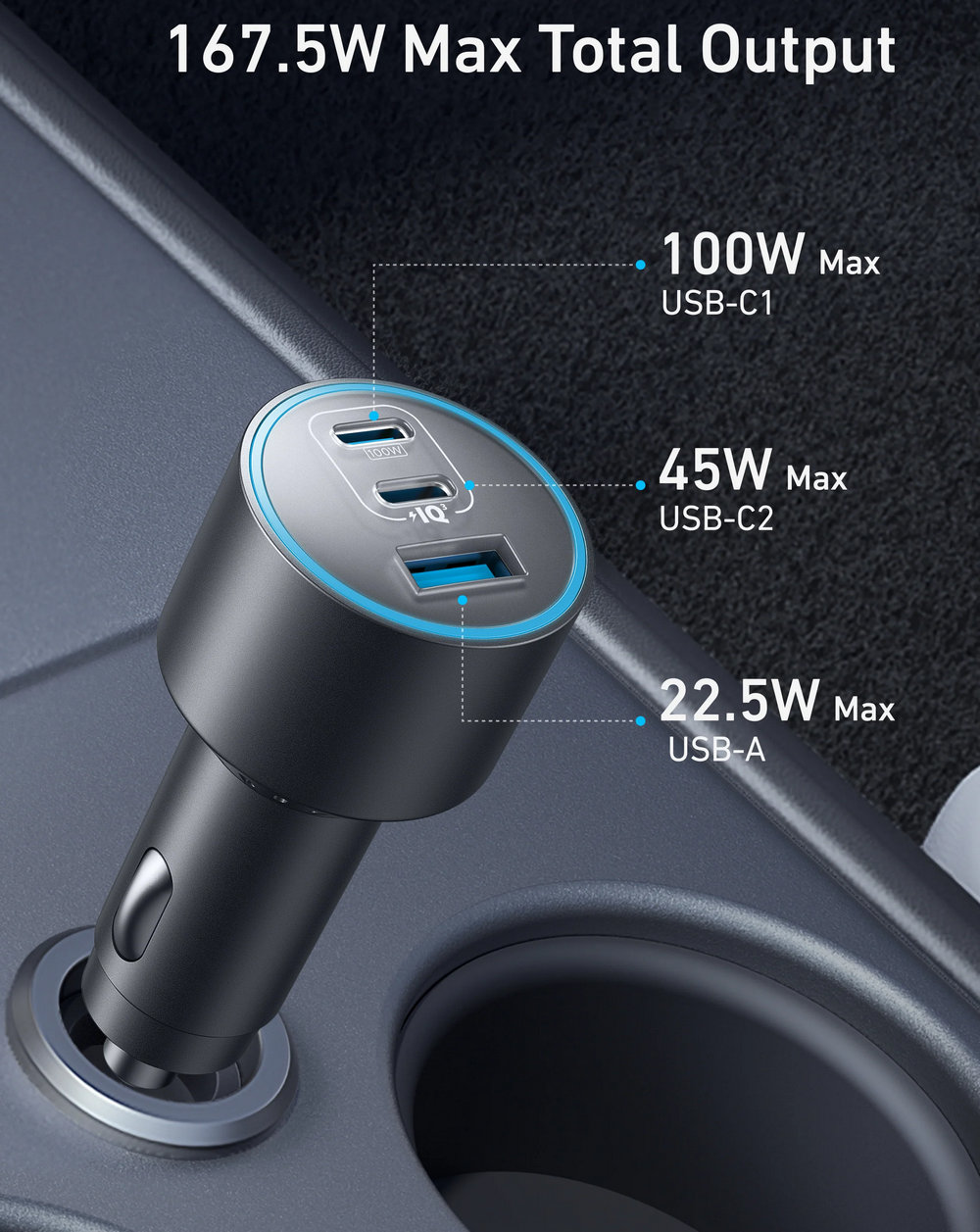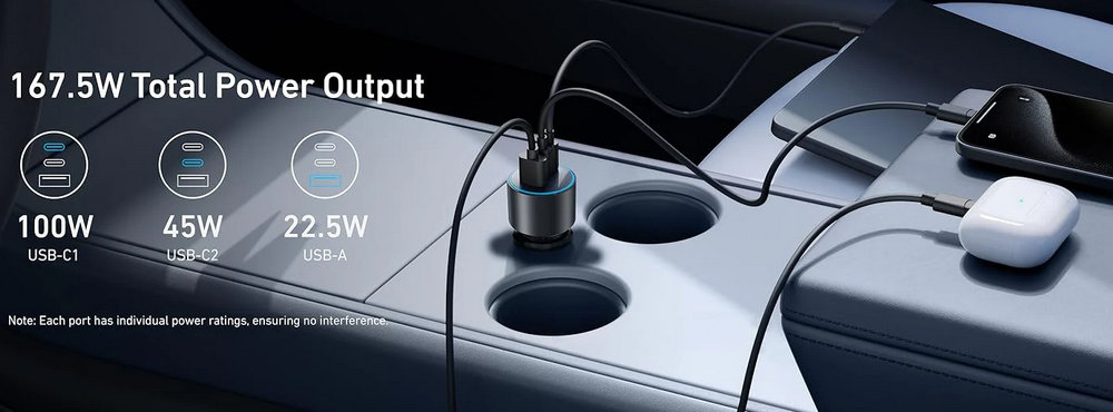 s.handsome Car Charger (167.5W, 3 Ports), 3.3 ft USB-C to USB-C cable, welcome guide, 18-month warranty, and our friendly customer service.