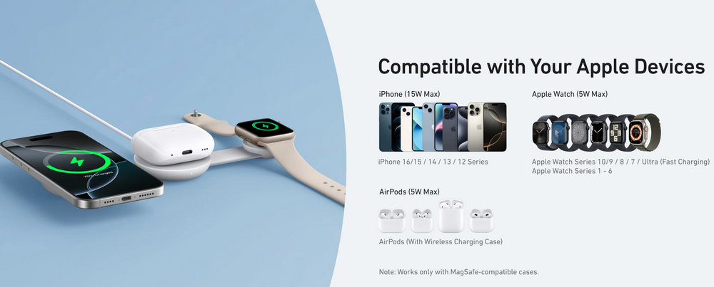 Offers robust safety features including temperature monitoring and protection against electrical anomalies, compatible with iPhones, AirPods, and Apple Watches.