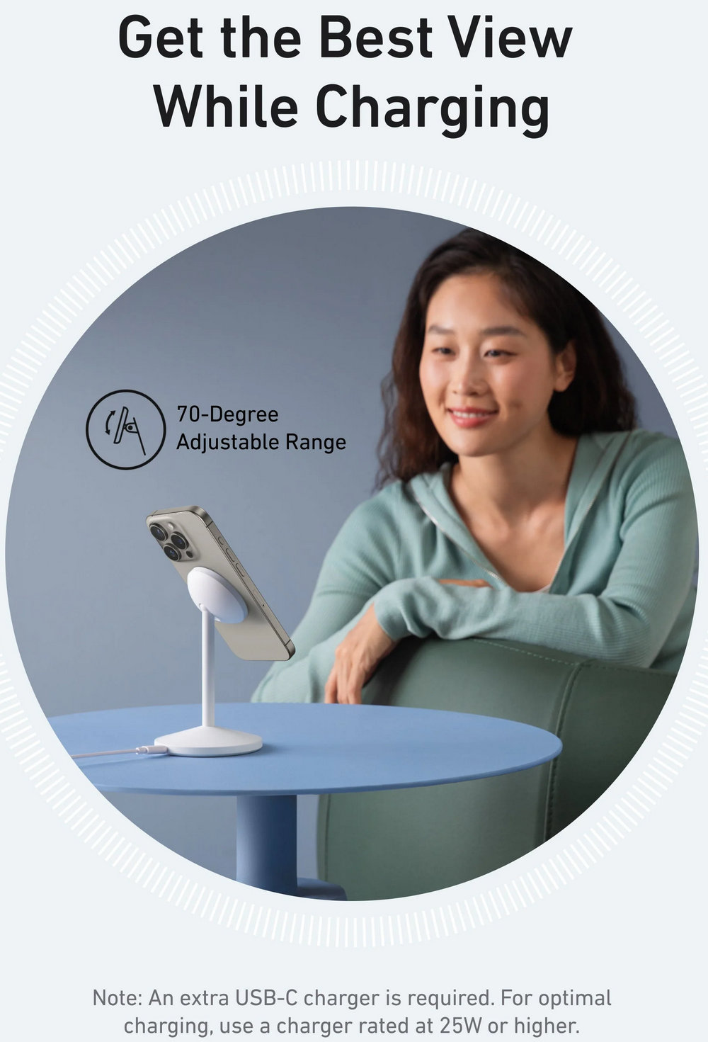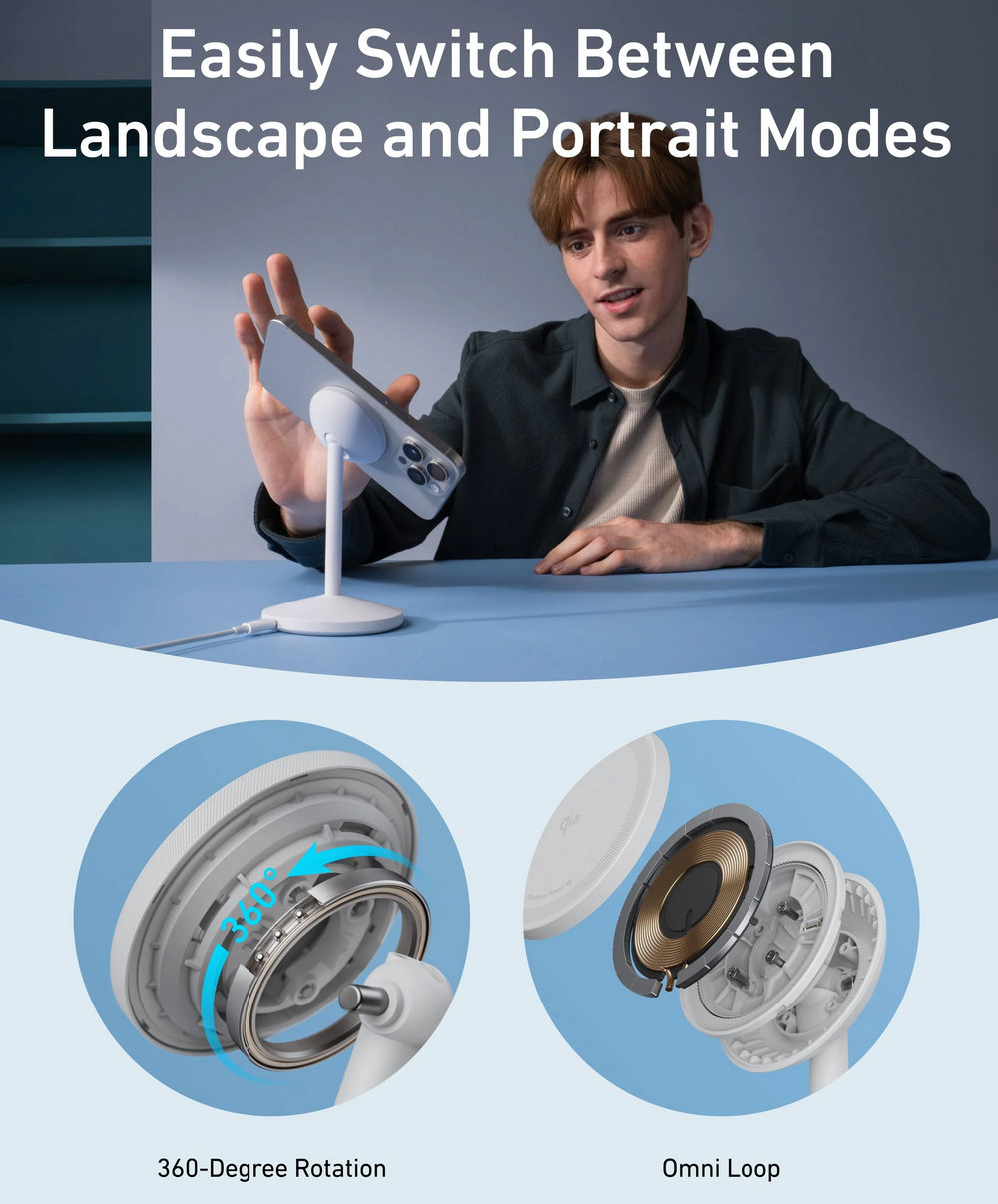 Equipped with Anker's exclusive rotating mechanism, this wireless charger fully supports the iPhone's StandBy Mode, allowing seamless transition between portrait and landscape orientations while optimizing power use and enhancing device efficiency during charging.