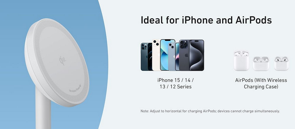 1. Adjust to horizontal for charging AirPods; devices cannot charge simultaneously.