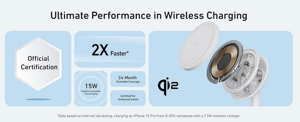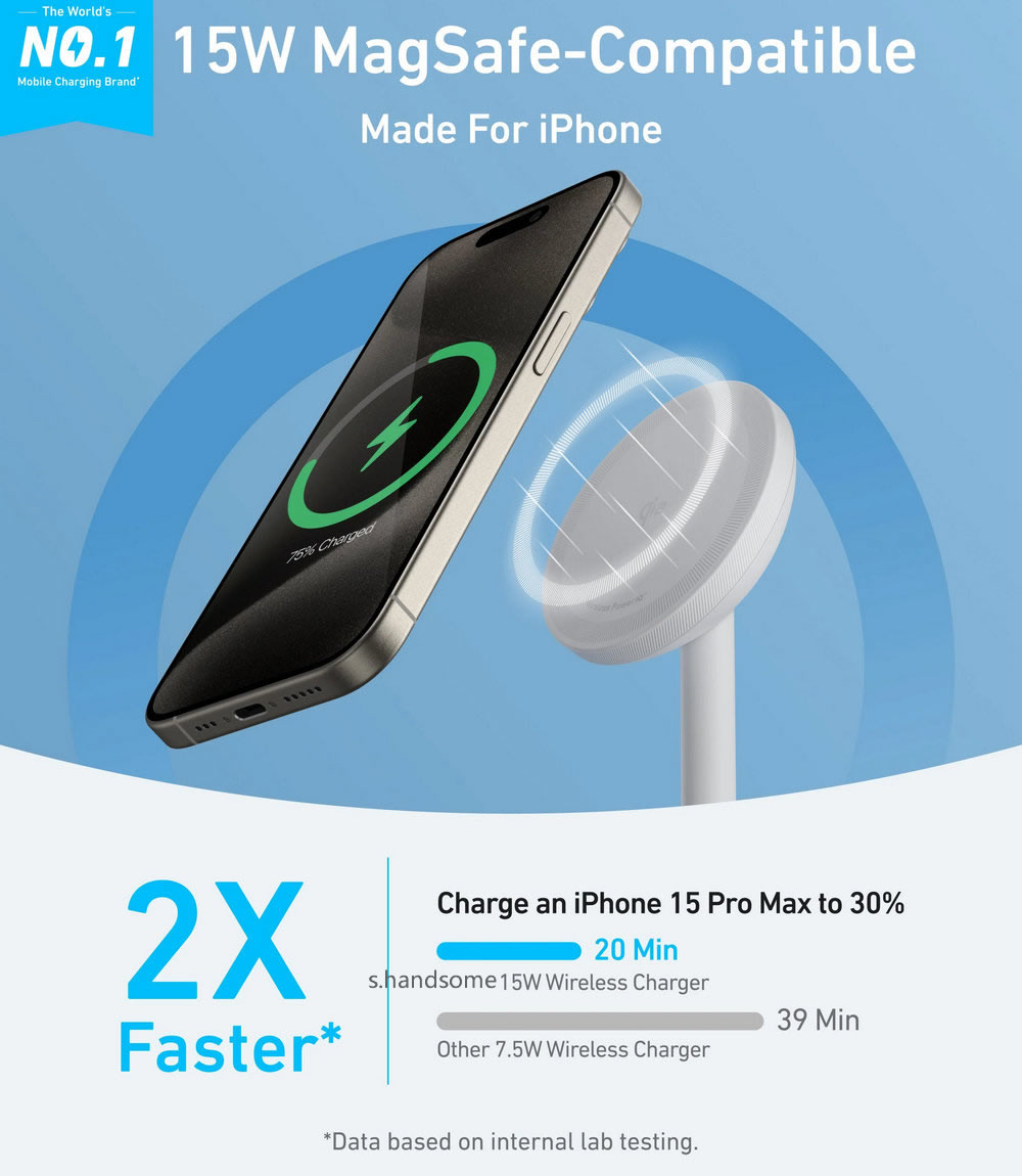 Achieve unparalleled charging efficiency with a certified 15W MagSafe-compatible charger that powers up an iPhone 15 Pro to 30% in just 20 minutes. (Note: Tested under ideal lab conditions. Actual charging times may vary with usage, environment, and device status.)