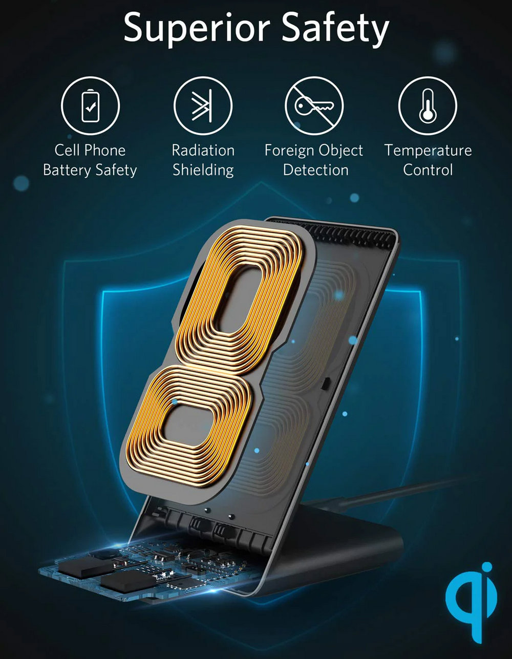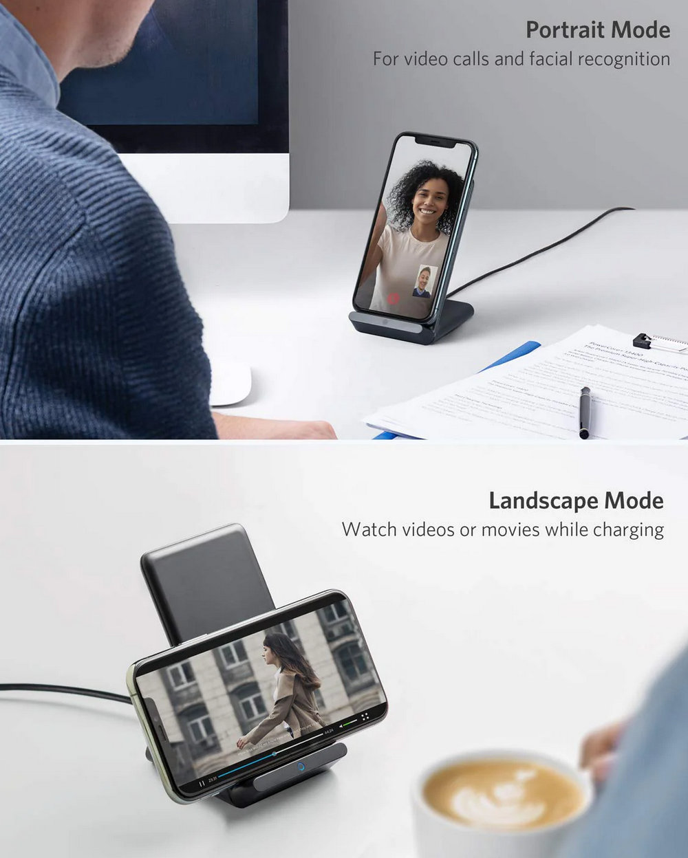 Twin charging coils let you watch videos in landscape orientation, or stand in portrait mode for web browsing and facial recognition—all while keeping the power flowing.