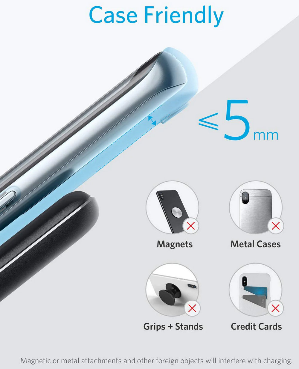 Cases made of metal and attachments such as magnets, cards, and grips will interfere with charging—including OtterBox defender cases.