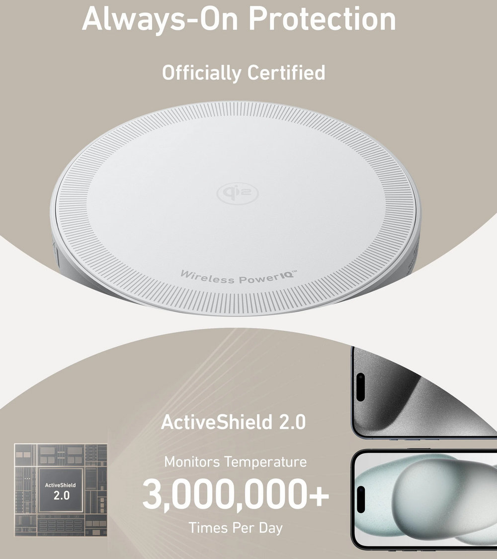 Get complete safety assurance with our Qi2 certification, accompanied by ActiveShield technology for meticulous temperature monitoring and comprehensive device protection.