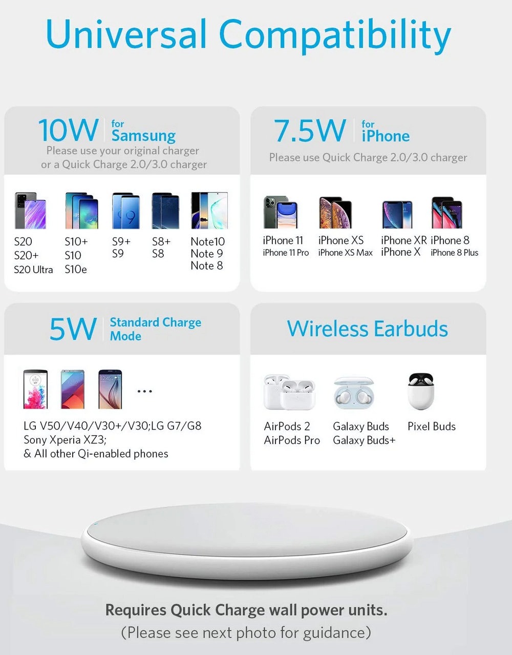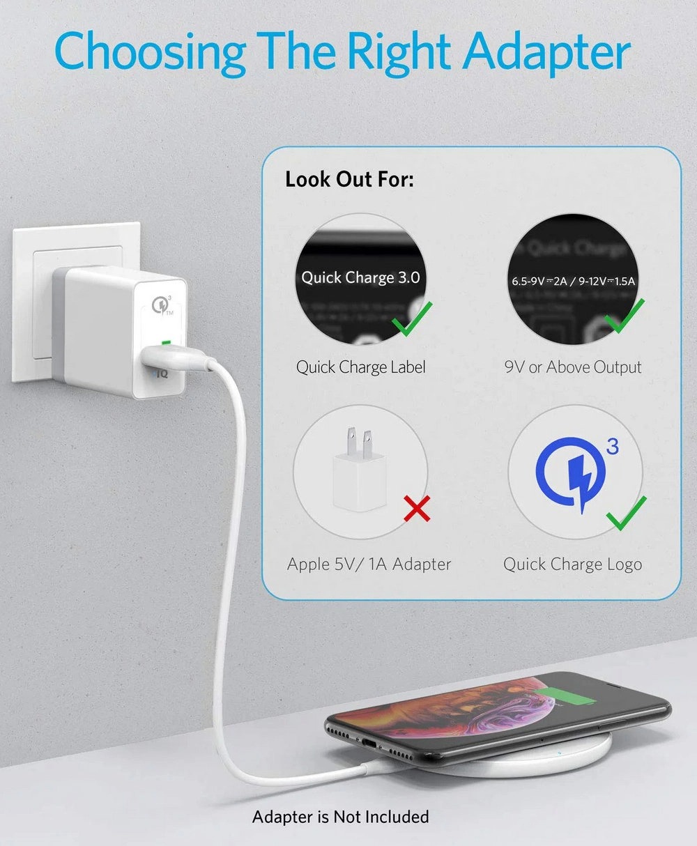 Quick Charge 2.0/3.0 wall adapter (9V/2A) required for fast charge mode.
