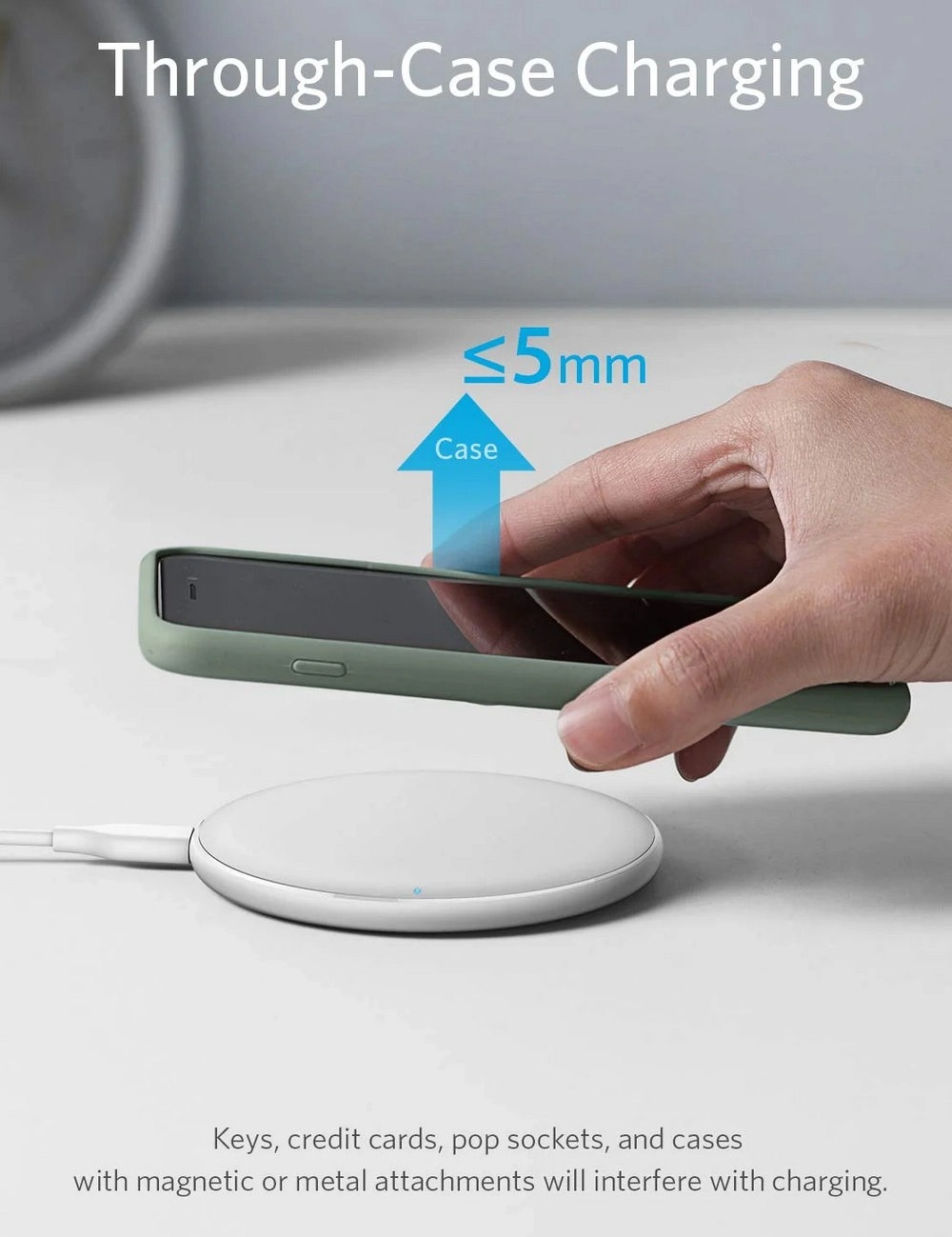 Cases made of metal and attachments such as magnets, cards, and grips will interfere with charging.