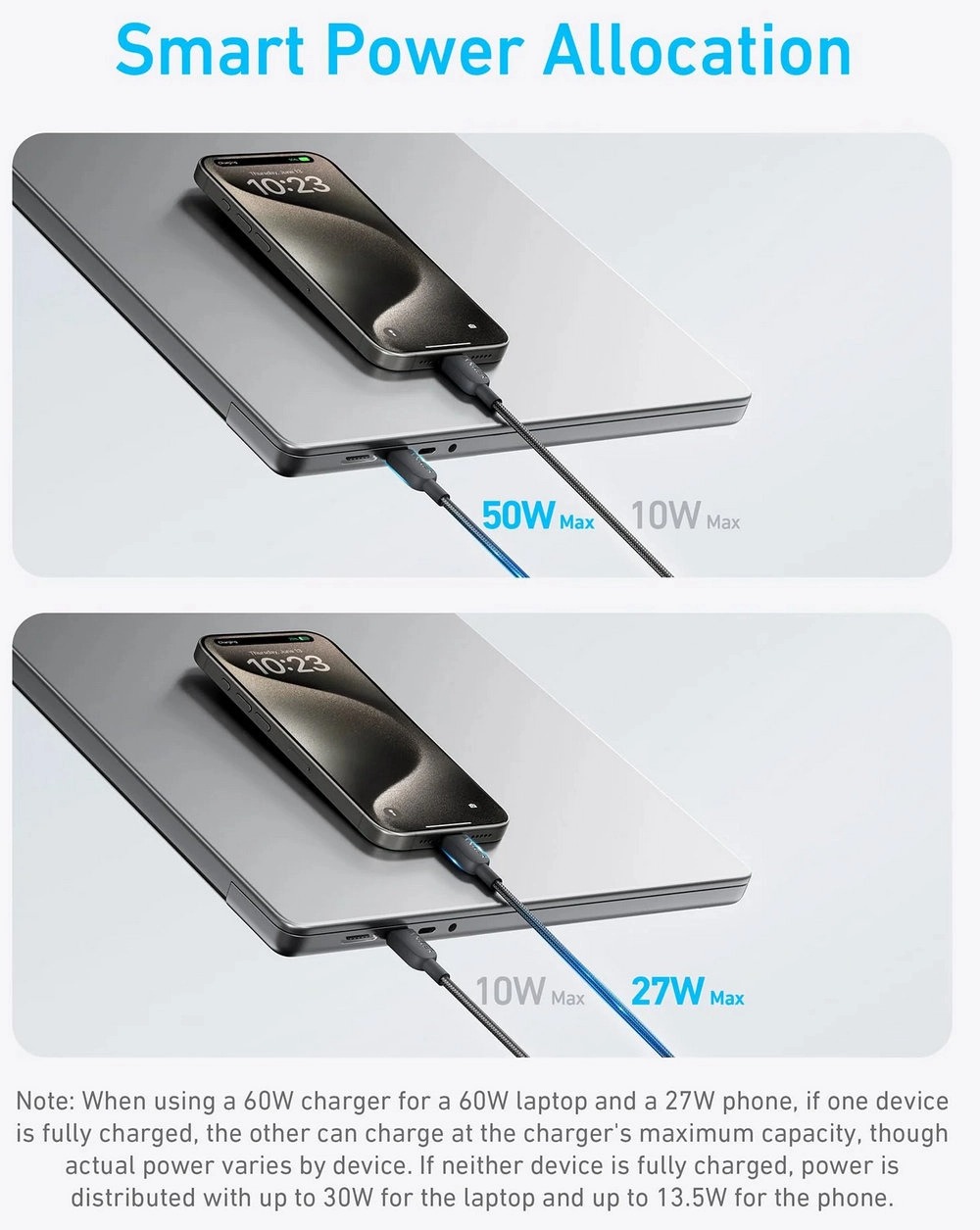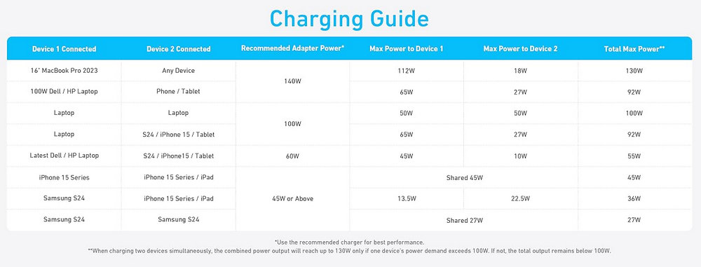 Intelligent Distribution of Power: Built-in smart power management adapts power output to match the charging requirements of each connected device seamlessly. Note: Please refer to the charging guide to understand the power allocation when charging two devices at the same time.