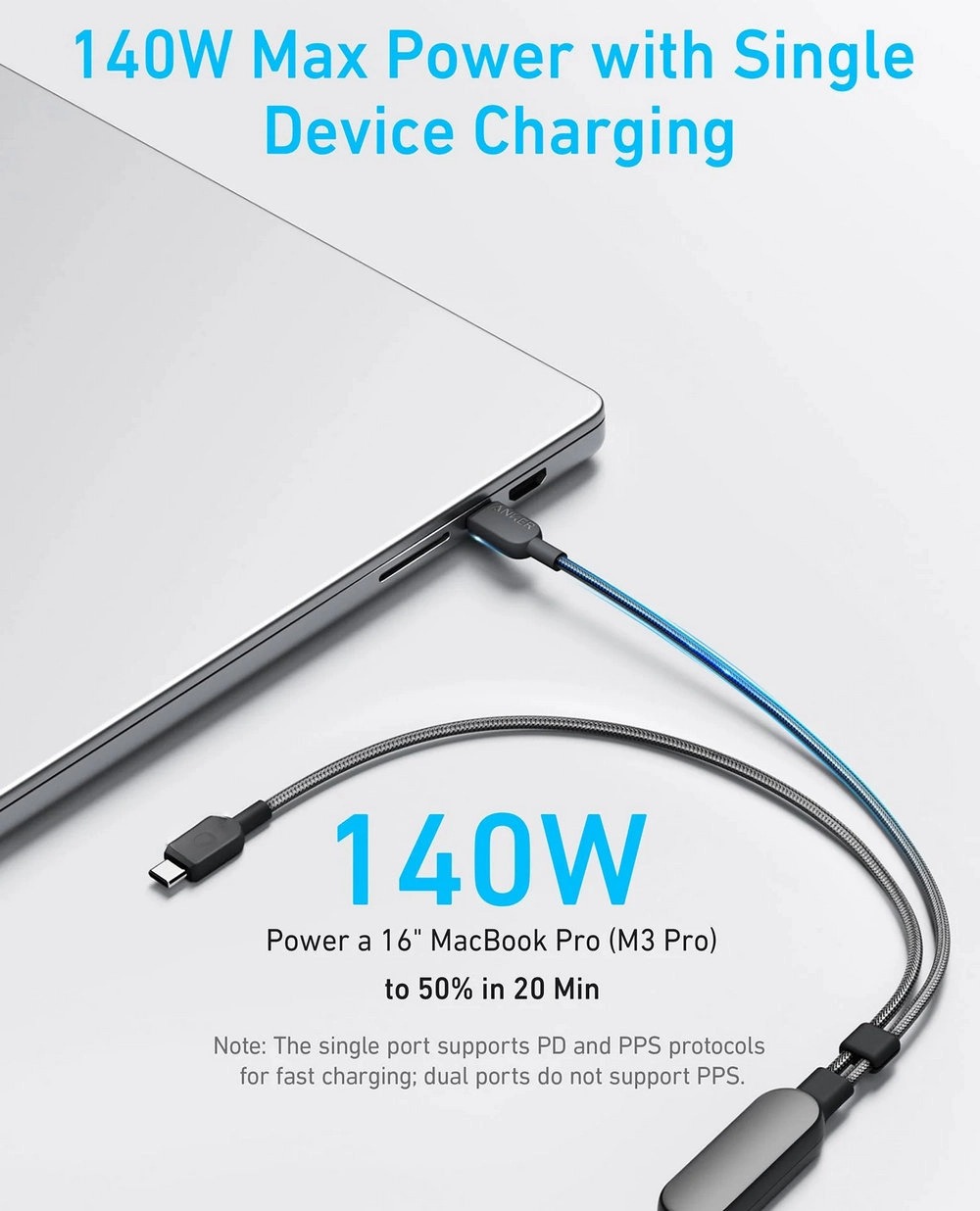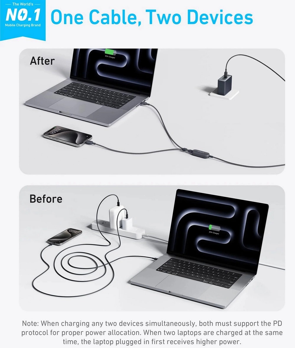 1. The cable supports PD, PPS, and PIQ 2.0 protocols for fast charging when using a single port; dual ports do not support PPS; 2. When only one device is connected, the charging power can reach up to 140W; 3. When two laptops are used simultaneously, the first laptop plugged in receives a higher power. The actual power each device receives depends on its power needs; 4. When charging two devices at the same time, the total maximum power can reach 130W only if one of the devices requires more than 100W. Otherwise, the total power will not exceed 100W; 5. Use the recommended power adapter for optimal results. Charging two devices with a charger less than 45W is not advised as it will result in slower charging. Both devices must support the PD charging protocol. Non-PD compatible devices may experience slower charging.
